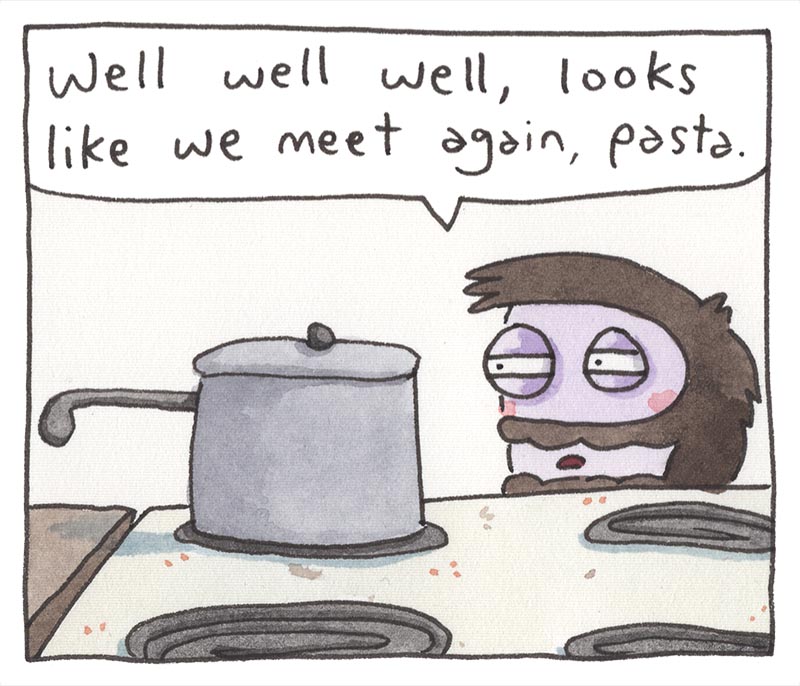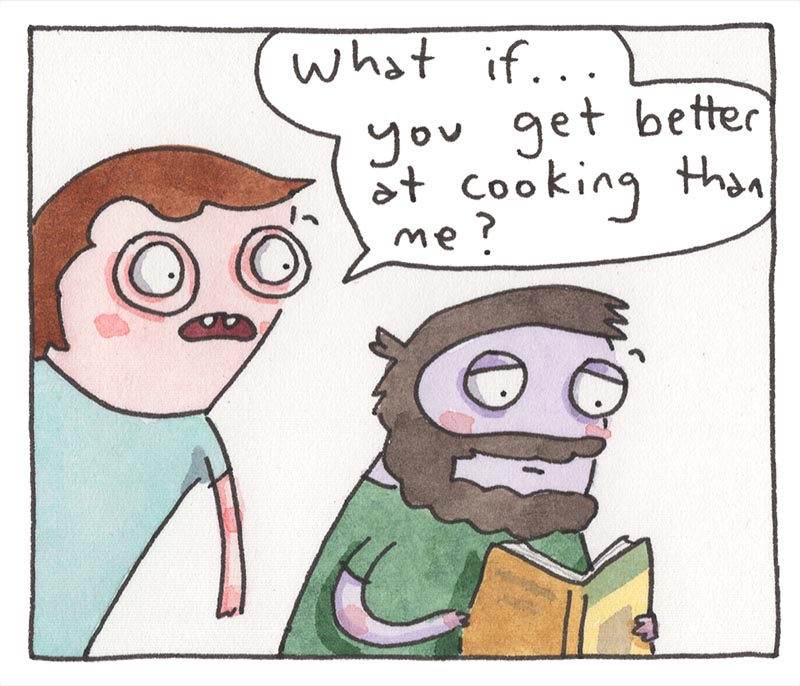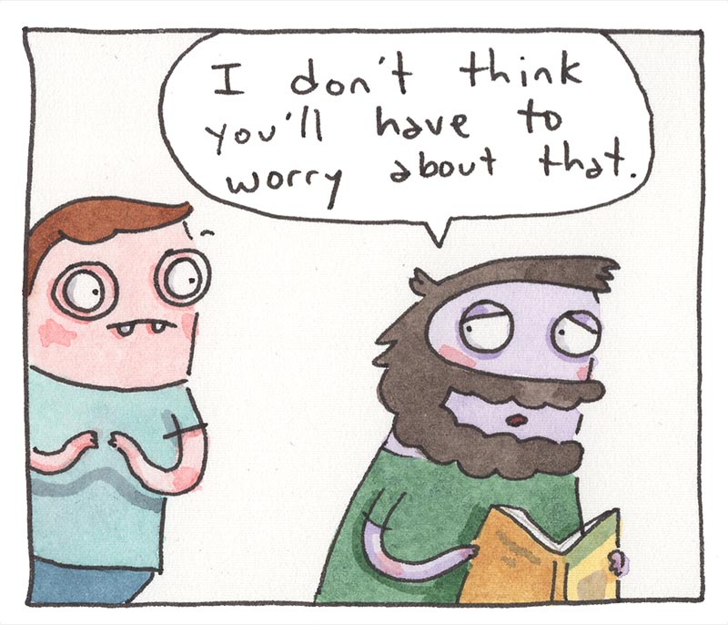 My inspiration comes from just bein’ alive, feelin' feelings, and drawing about 'em. Every comic is made the old-timey way in watercolor, then put online the new-timey way for humans like you to read!