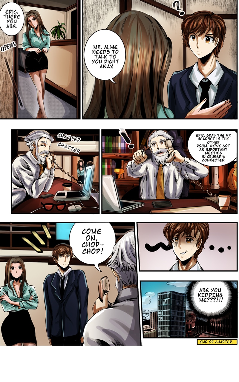 In the near future, Crusadia Connected is an extremely popular online, virtual reality game. It is so popular that almost everyone on earth has an account. Players are encouraged to play however they want: go on quests, shop, date, join a guild, and most importantly connect with others. Crusadia Connected is celebrating its seventh year and soon there will be a major announcement that will change everything...