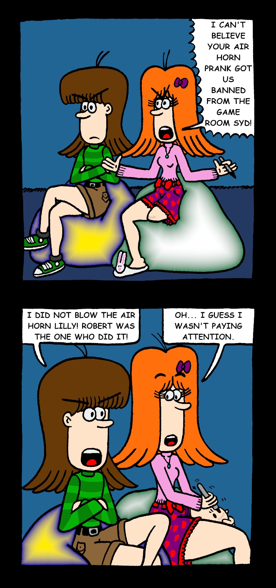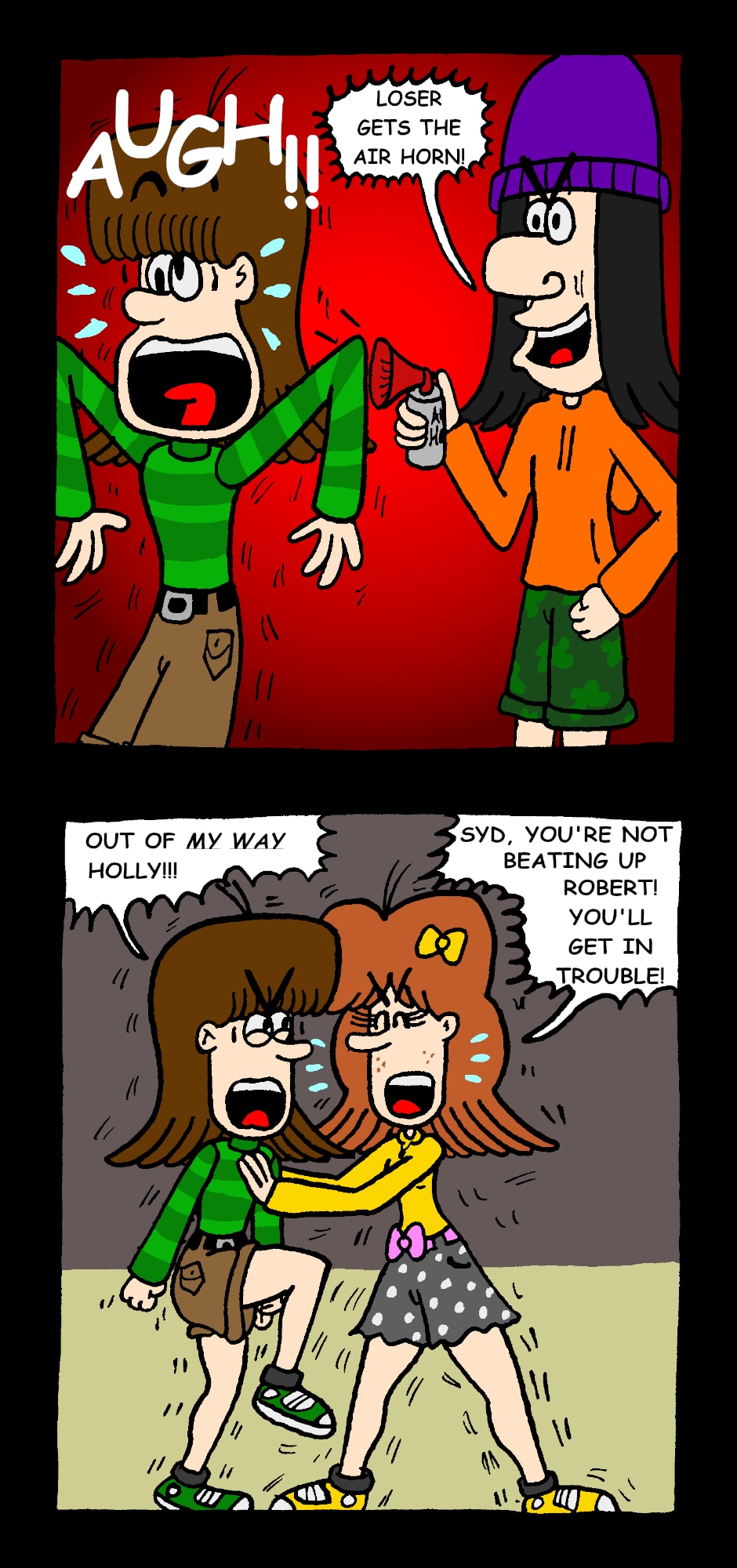 Syd's World is a comic series about Syd, his family, and his friends getting into all kinds of mischief. Syd's family includes his siblings Holly, Alex, and Grace, cousins Mark and Robert, and his parents Marie and Bruce. Craig, Austin, and Pete are Syd's friends and has a girlfriend (now cousin-in-law) named Lilly. The five of them are in a band called Marshmallow Head.