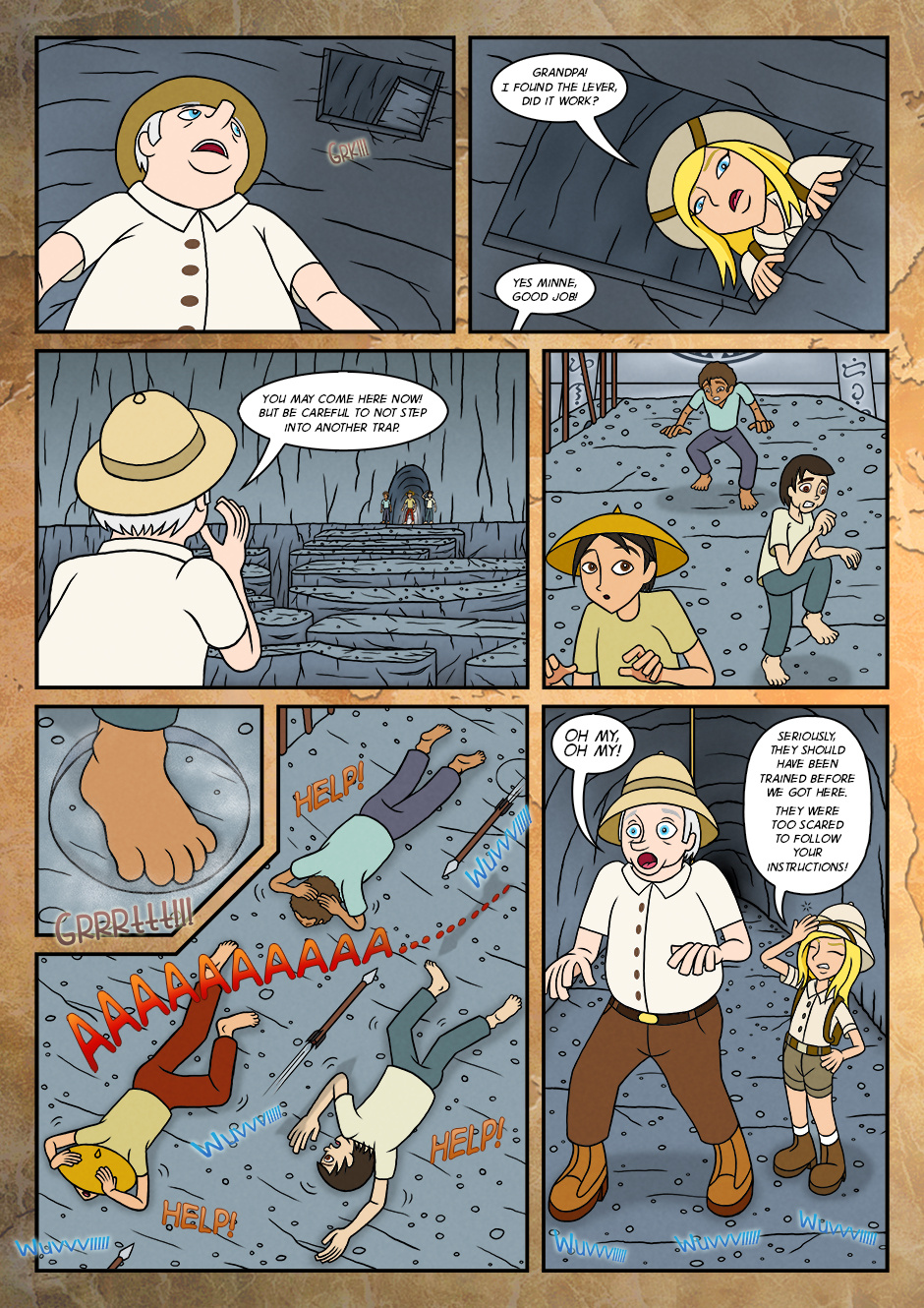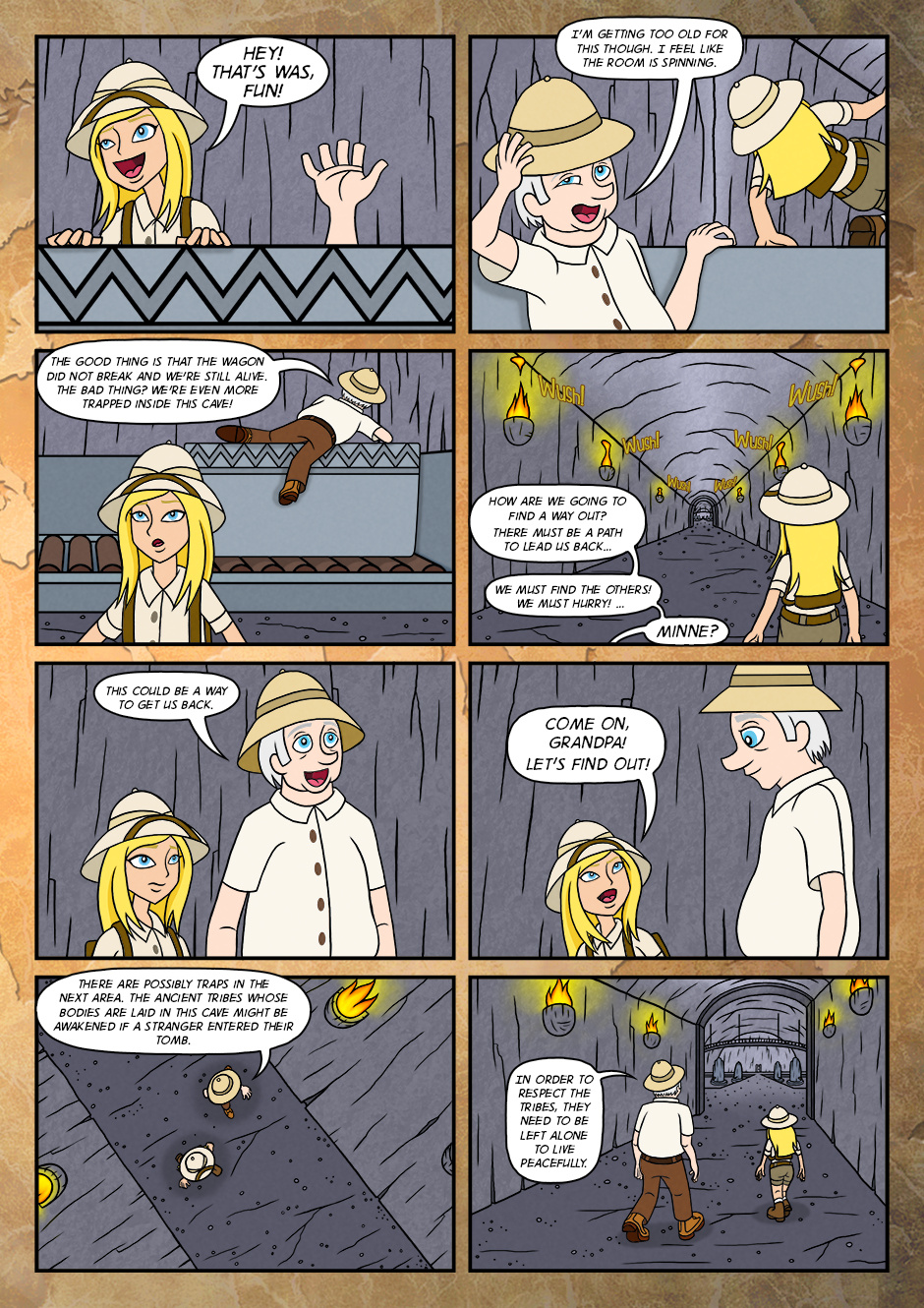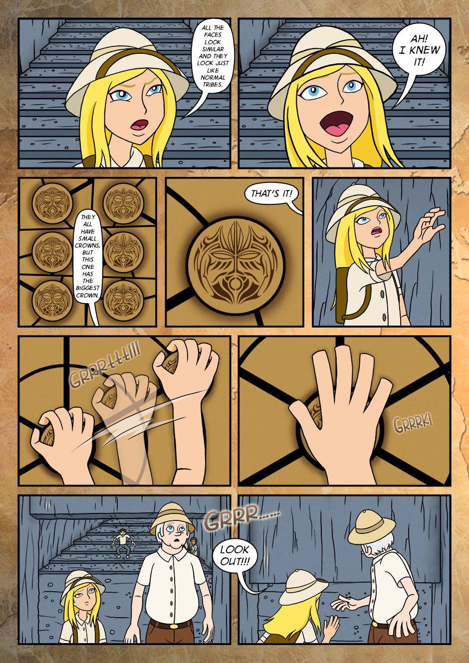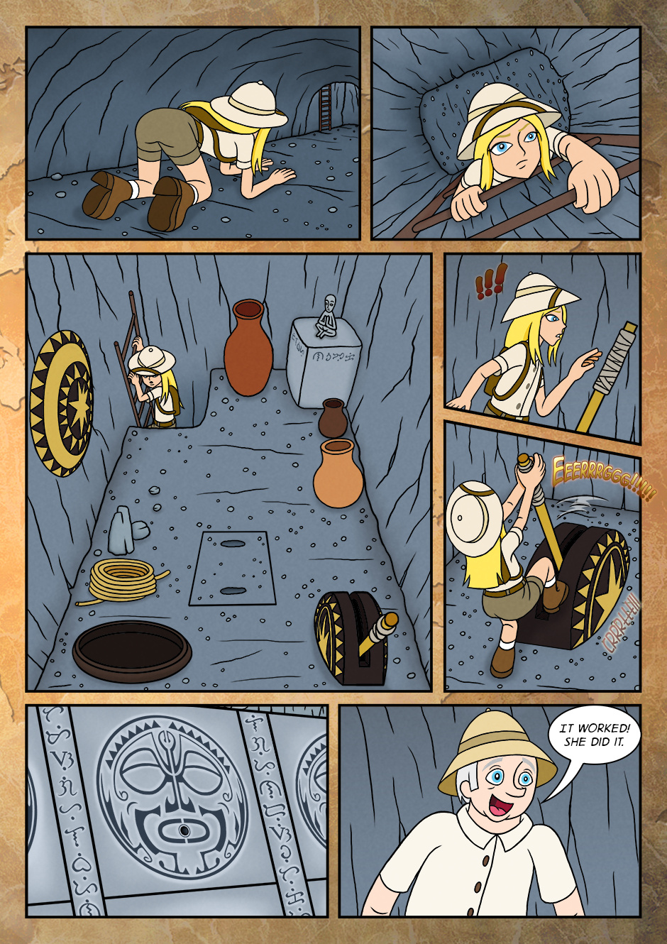 As her adventure for the first time, she went along with grandfather and assisted him to find the objects that were buried long time ago.