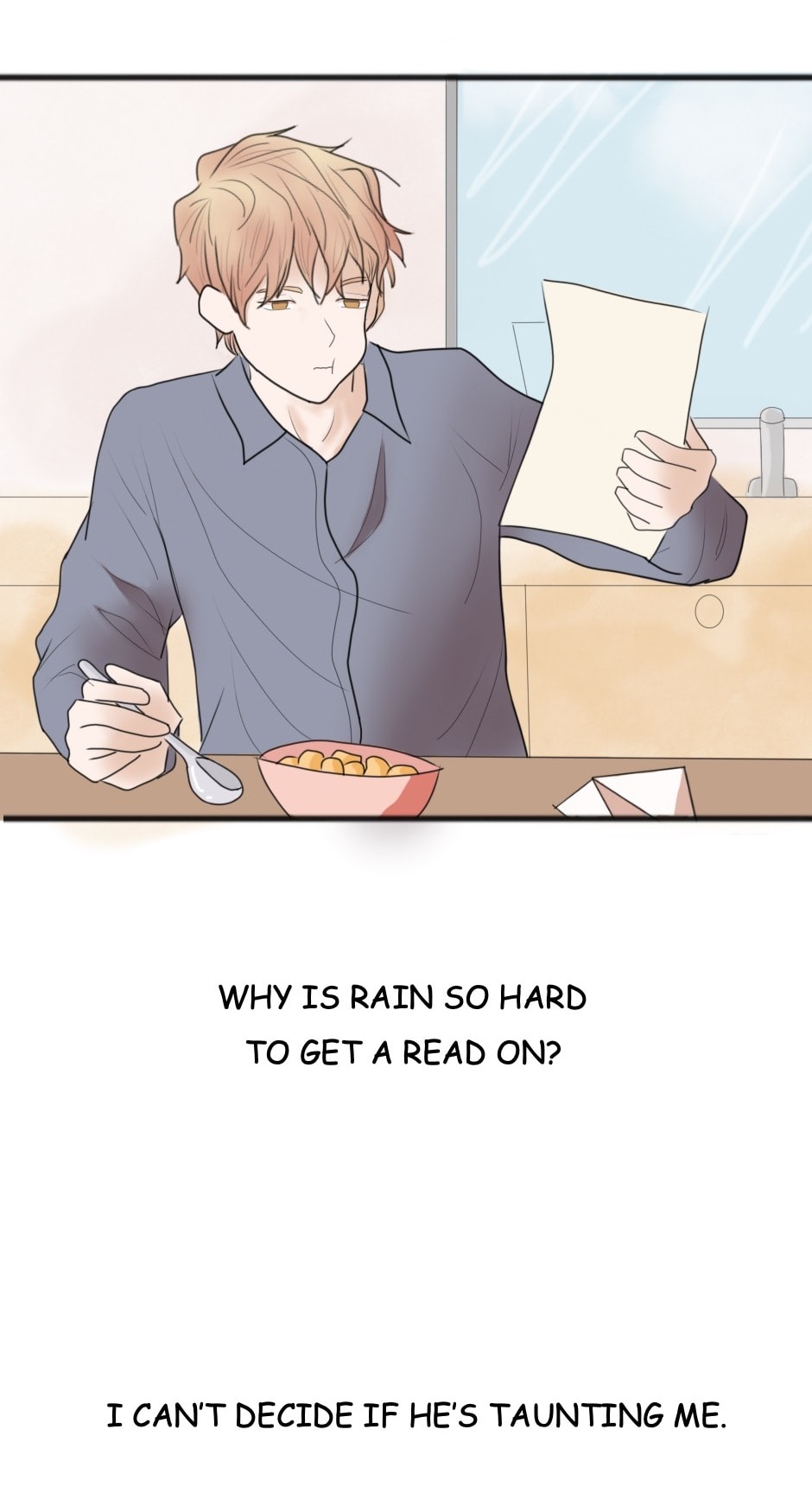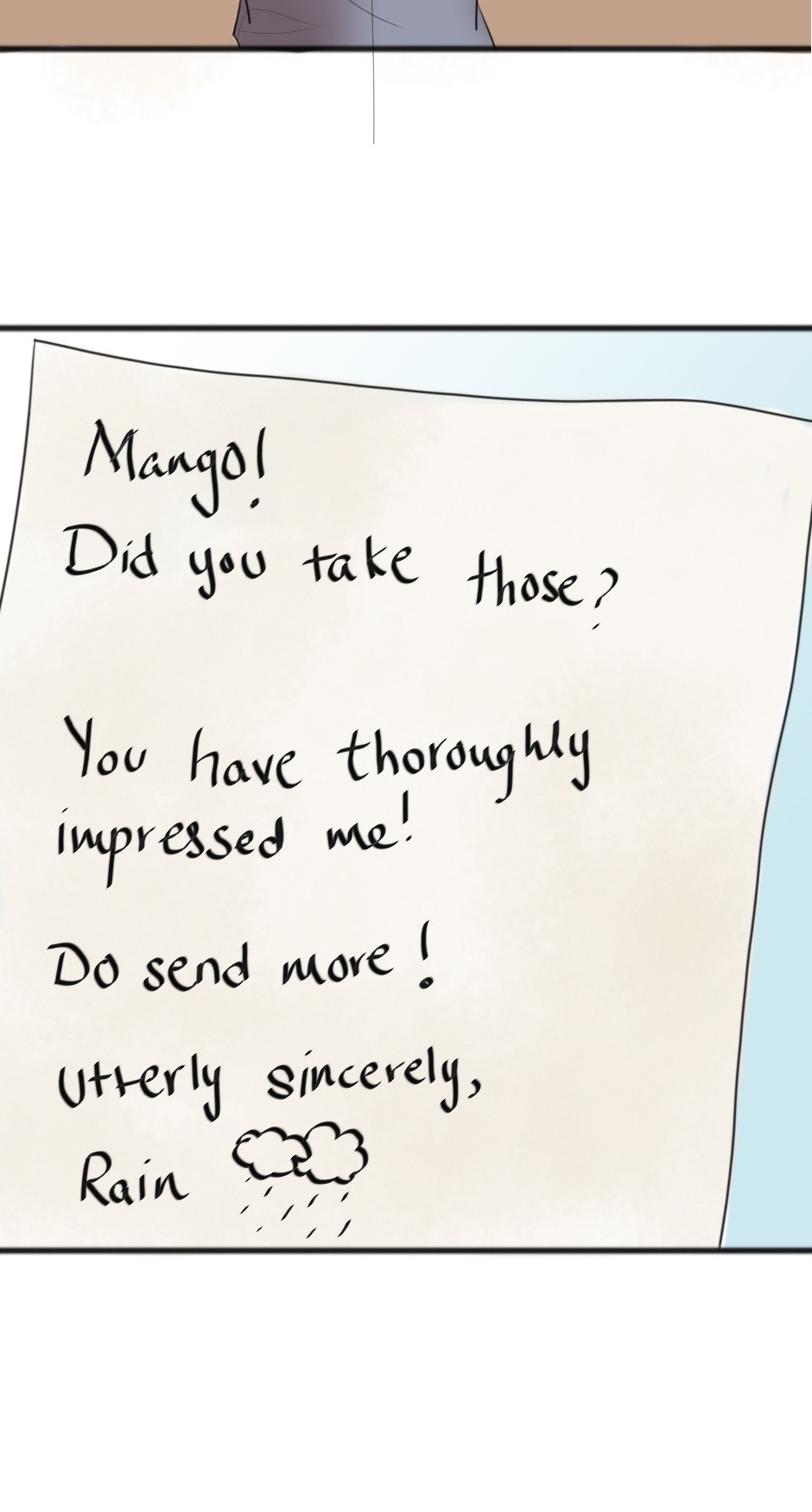 For some clarity on what's going on in Rain's mind while writing his letters to Asher and why this one was so different from the previous ones: Rain literally doesn't care about Mango enough to spare him some figment of his mind by imbedding useless mannerism in his letters. Rain just wrote down whatever he thought, with no mind-to-hand filter, to Asher not thinking or caring if it was rude.