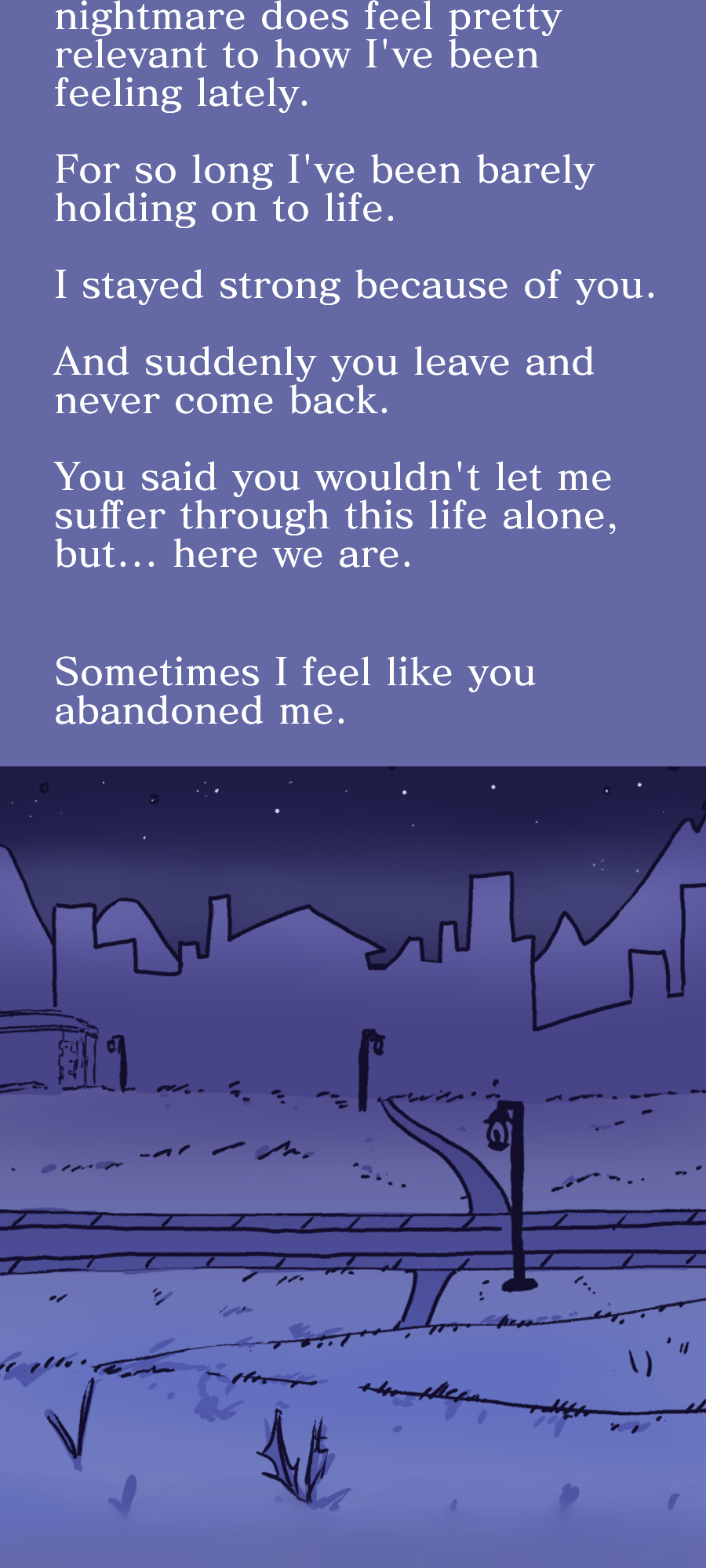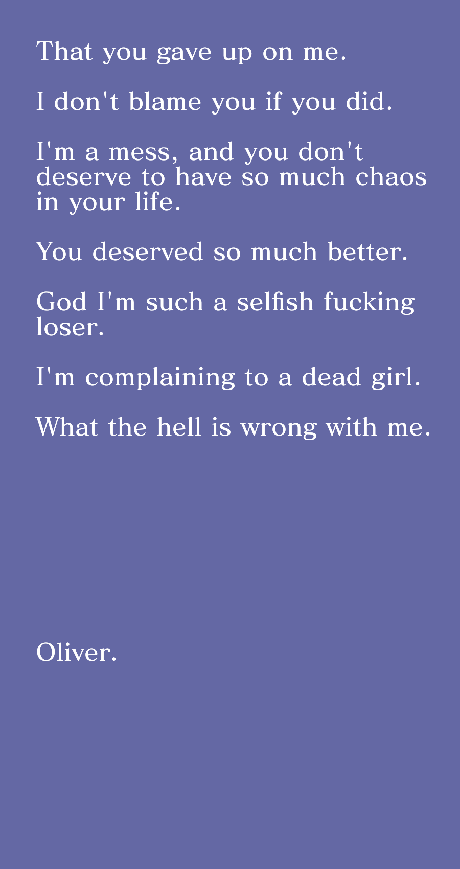 And now that you're gone, all I have to give are these letters: all of my pain, all of my love... and my regrets -- all in here. Inside my collection of memories.