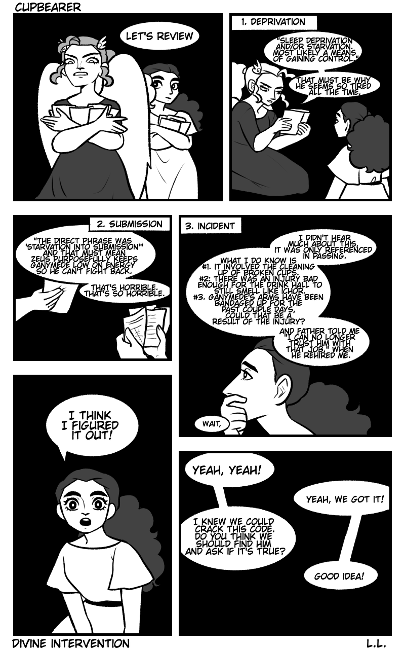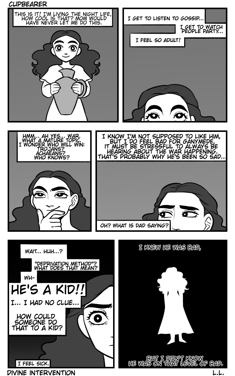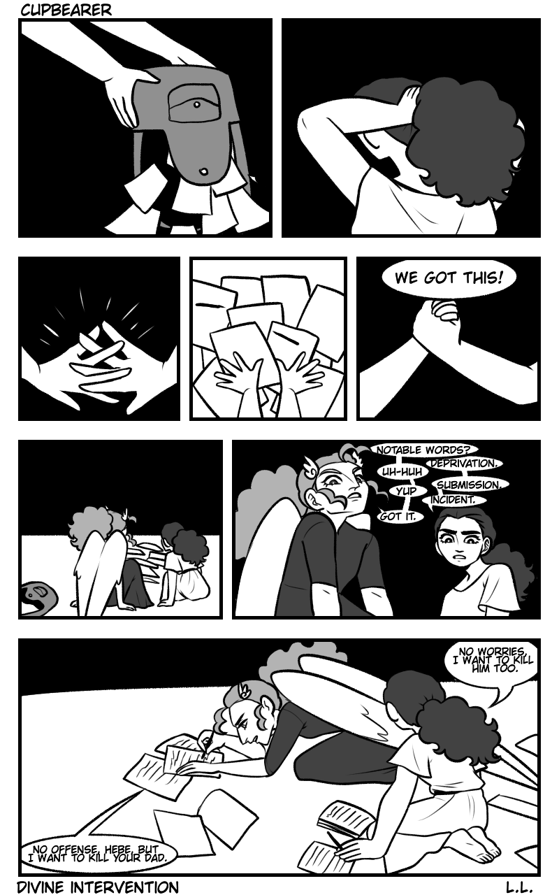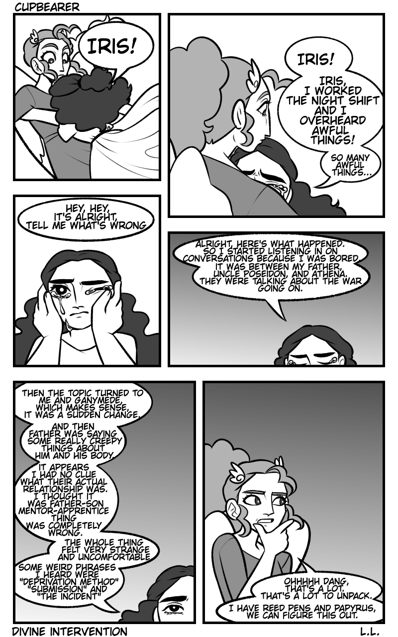 Two godlings share the same job on Mount Olympus, and they must either become rivals or find solidarity and become friends. The people at the top want them to fight for their positions, but will they rebel? this is my take on the Aquarius myth, it is in a series of prequel comics for a larger Zodiac/Greek Mythology based video game called Divine Intervention. (trigger warning: discussions of abuse, toxic relationships, self harm, and suicidal ideation. this is a sad comic, so know your limits)