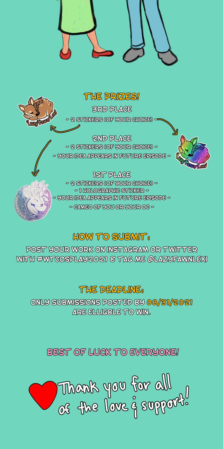 - Make sure to use #WTCosplay2021 and tag me @lazyfawnlexi on either Instagram or Twitter by 8/31/2021. BEST OF LUCK TO ALL PARTICIPANTS