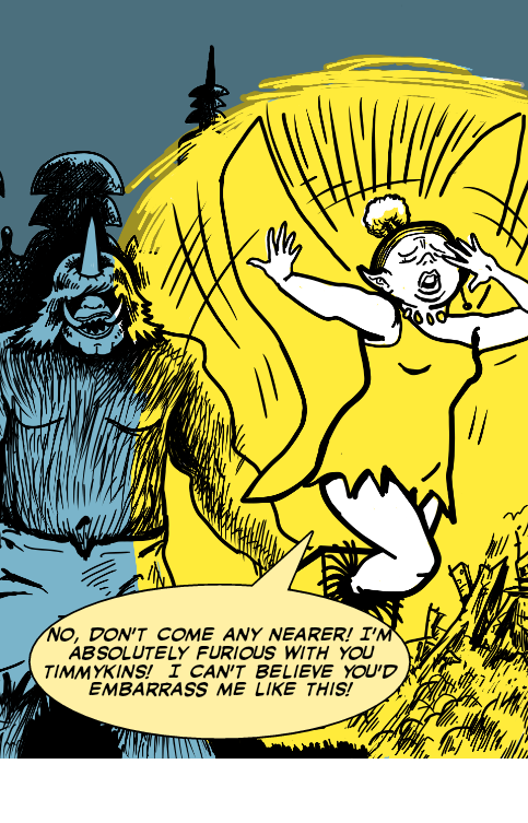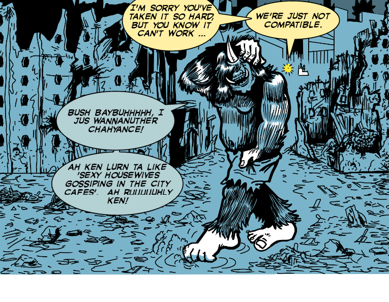 So what have we this week, well a hopefully amusing explanation of the monster invasion and city block devastation. The joke of course stems from misunderstanding, a clash between our reading of the situation and the private views of the two insiders, the two lovers. We can see of course, with our outsider's eye that there are some differences between them chiefly the huge size discrepancy, but as always life fools us and the real reason for their bust-up is something more banal and bizarre, a disagreement over a TV programme ... and the obvious infidelities of the hairy man-monster.