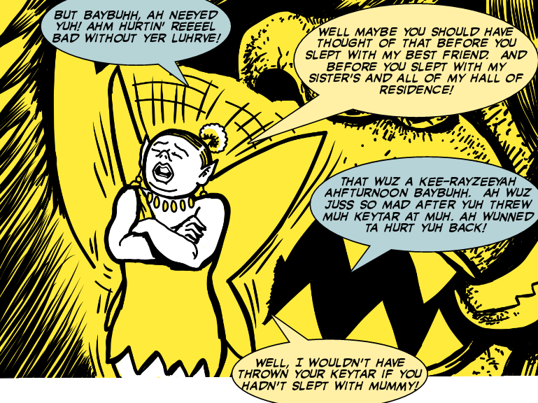 Another difference of course is their speech patterns. Misty sounds middle-class whereas Timmykins has a strange way of speaking that is slightly based on Elvis. The reason is probably that Elvis is still the ultimate alpha male, the epitome of raunchy, carefree, free-wheeling masculinity that I suspect Timmykins aspires to, whilst secretly wanting a mother figure ... so not so freewheeling after all.