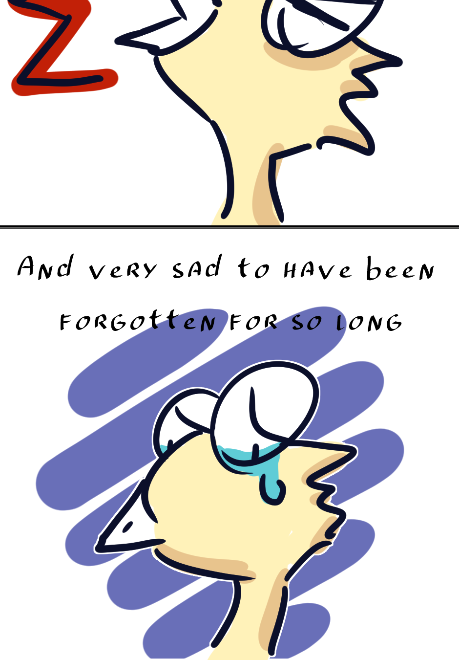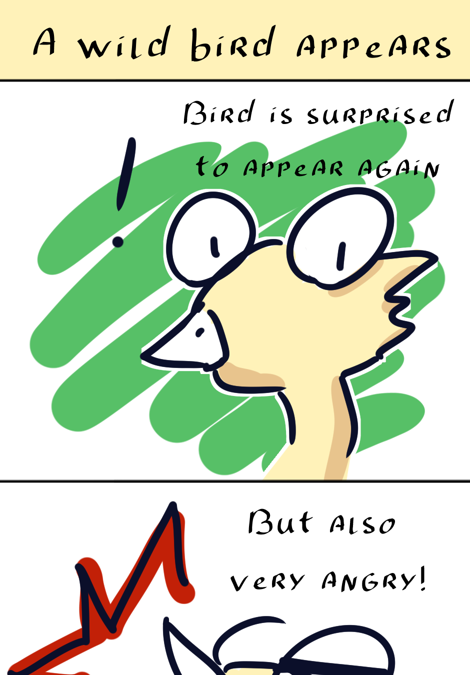 Hahahaha how long has it been?????? Two years or so???? Anyways, Bird got a small redesign because this art style is way easier to draw hahaha Also, look at me I made a font for this comic. It's a bit wacky but it'll do "^^