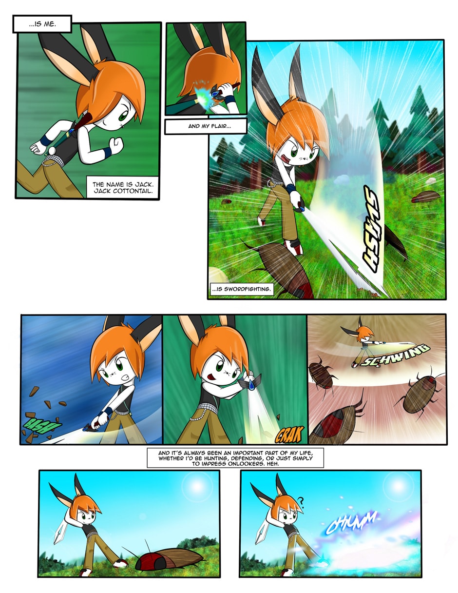 Now we are introduced to the comic's protagonist who appears to be hunting some Arboroaches. Wait...who stole his kill at the last panel? You'll find out in the next page.