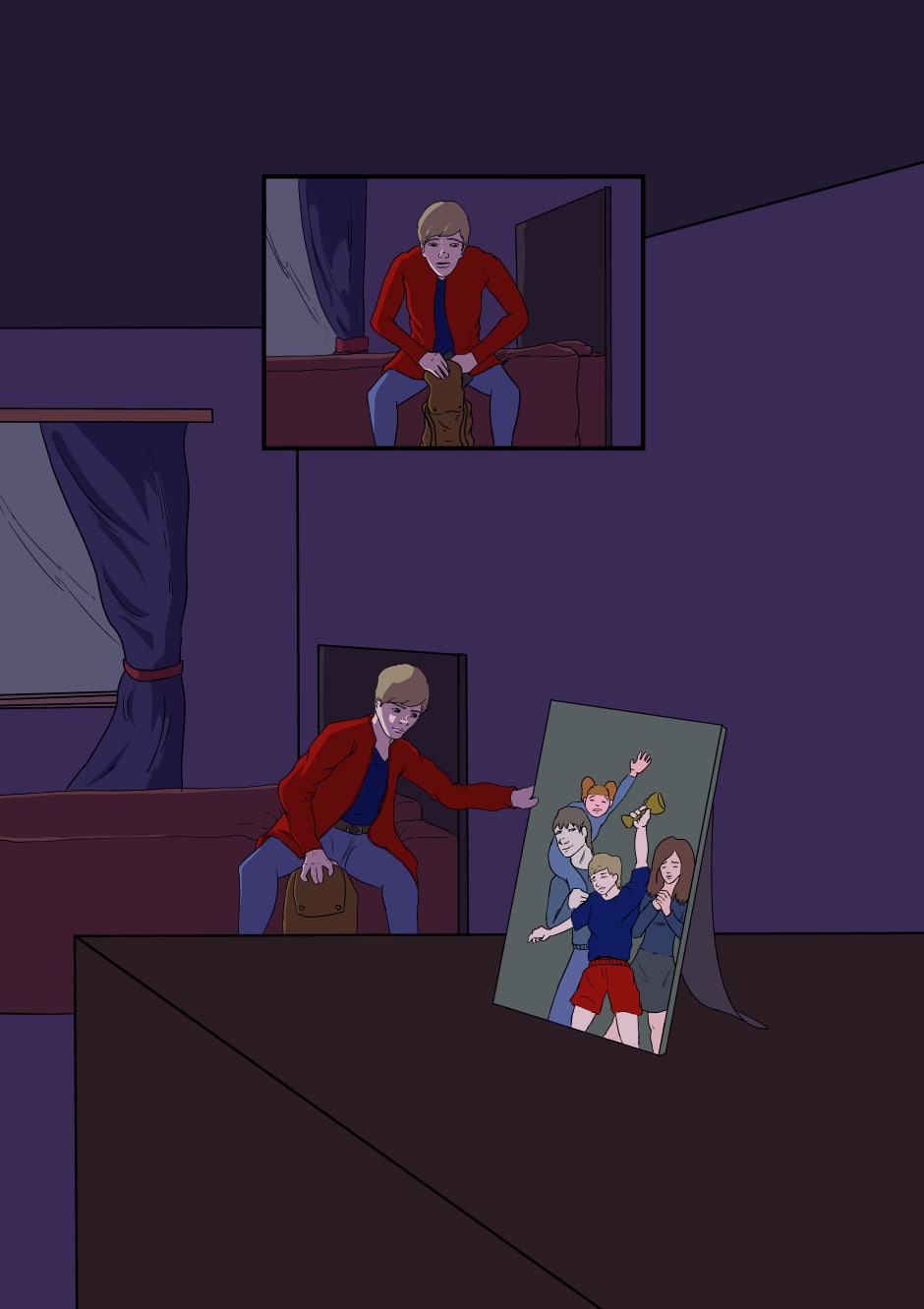 Alone in his room thinking about his dad.
