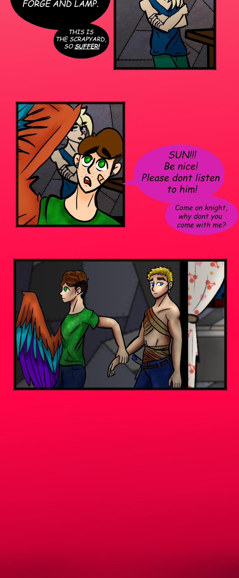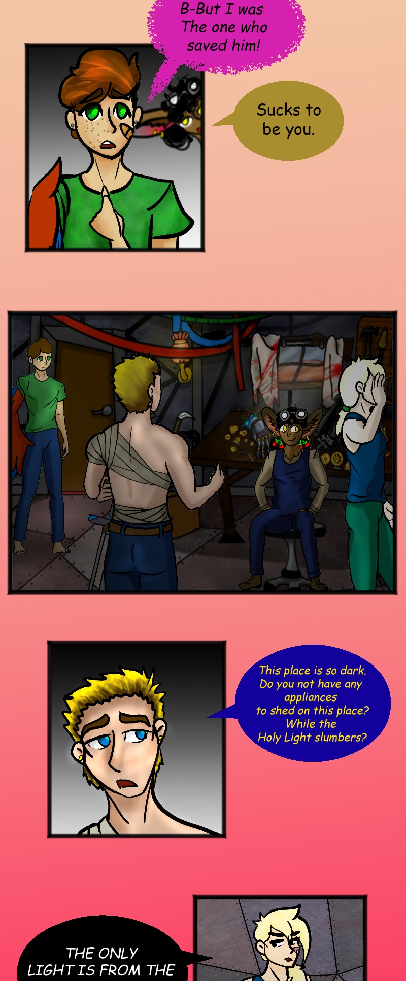 An insane knight-zealot, a grouchy cyborg, a bonkers mechanic, a cannibalistic fairy, and a one-winged freak, embark on misadventures.