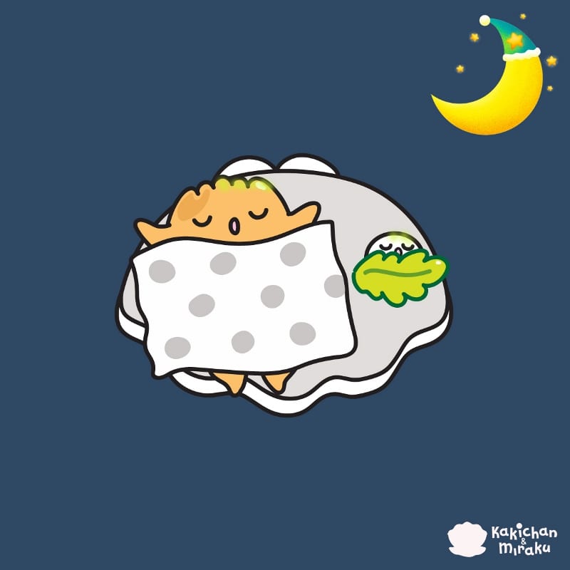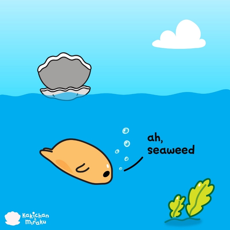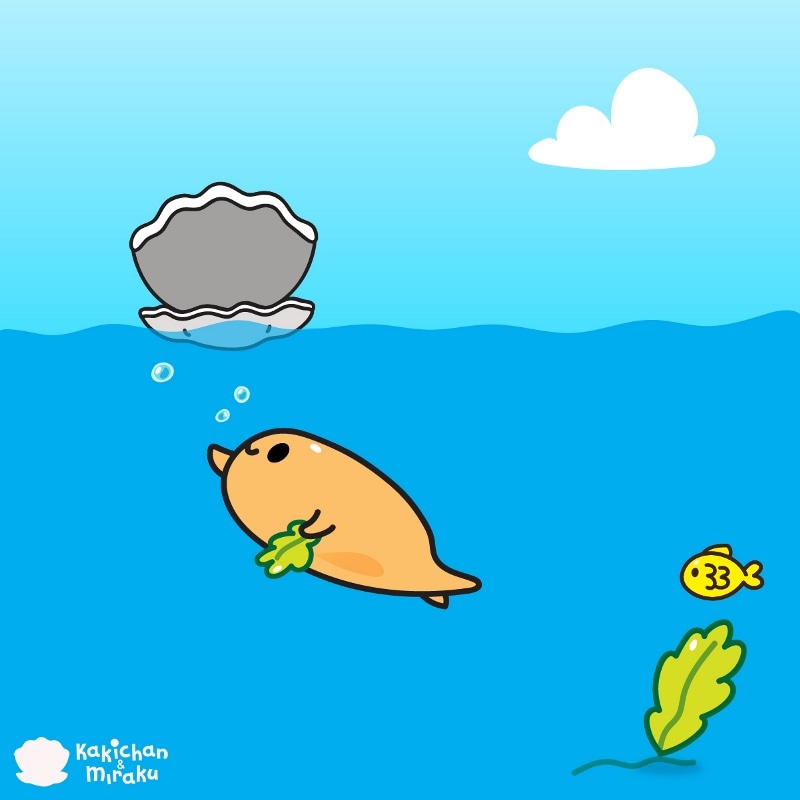 Kakichan the oyster swims under the sea to look for a little seaweed. He plans to use this as a blanket for his pearl friend. After drying it, he uses it as a small blanket for Tamachan the pearl.
