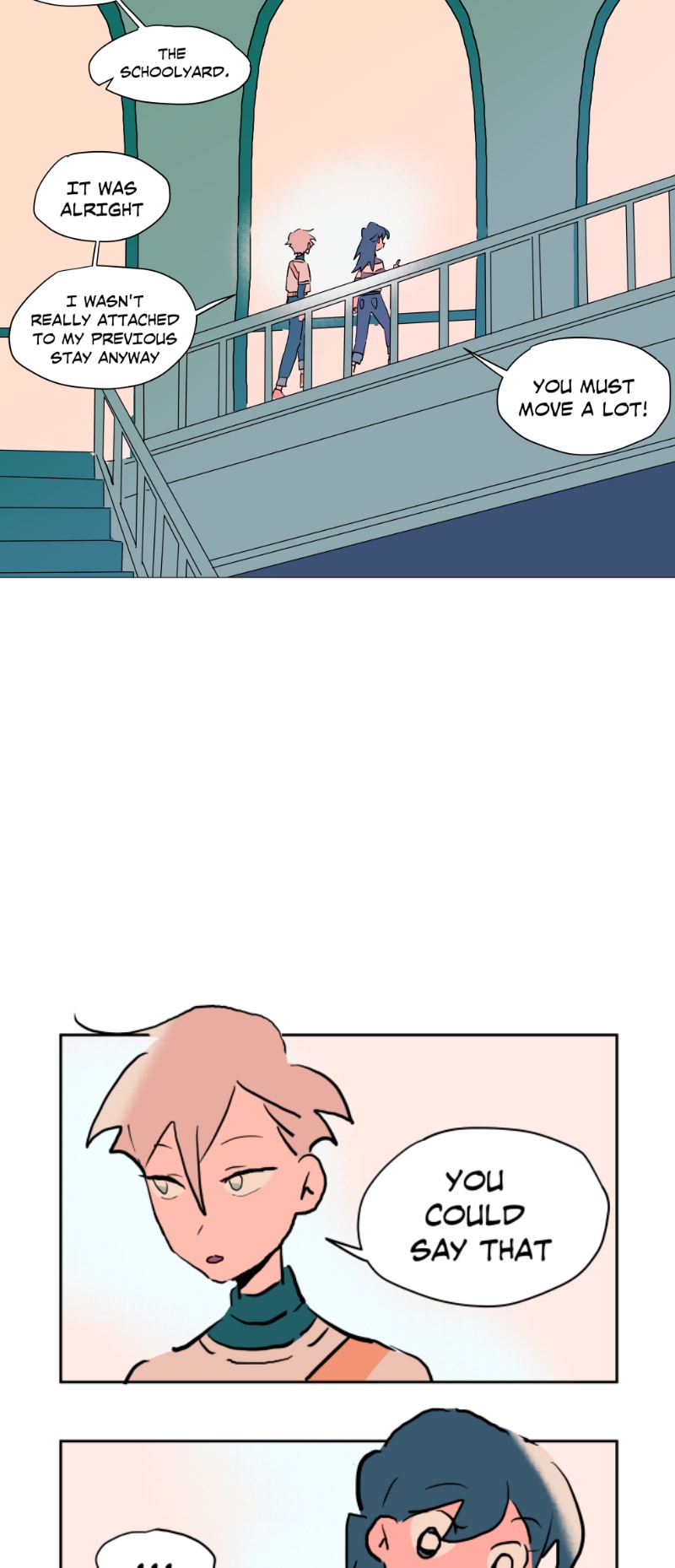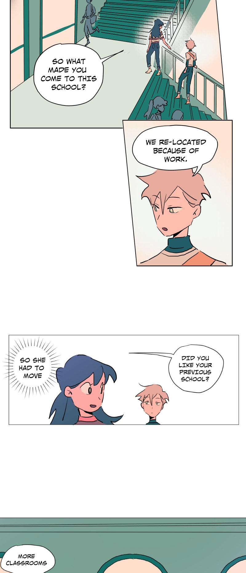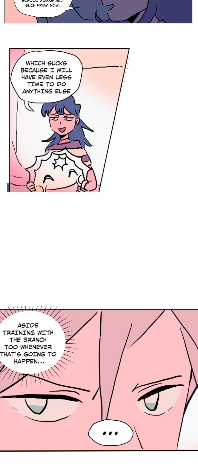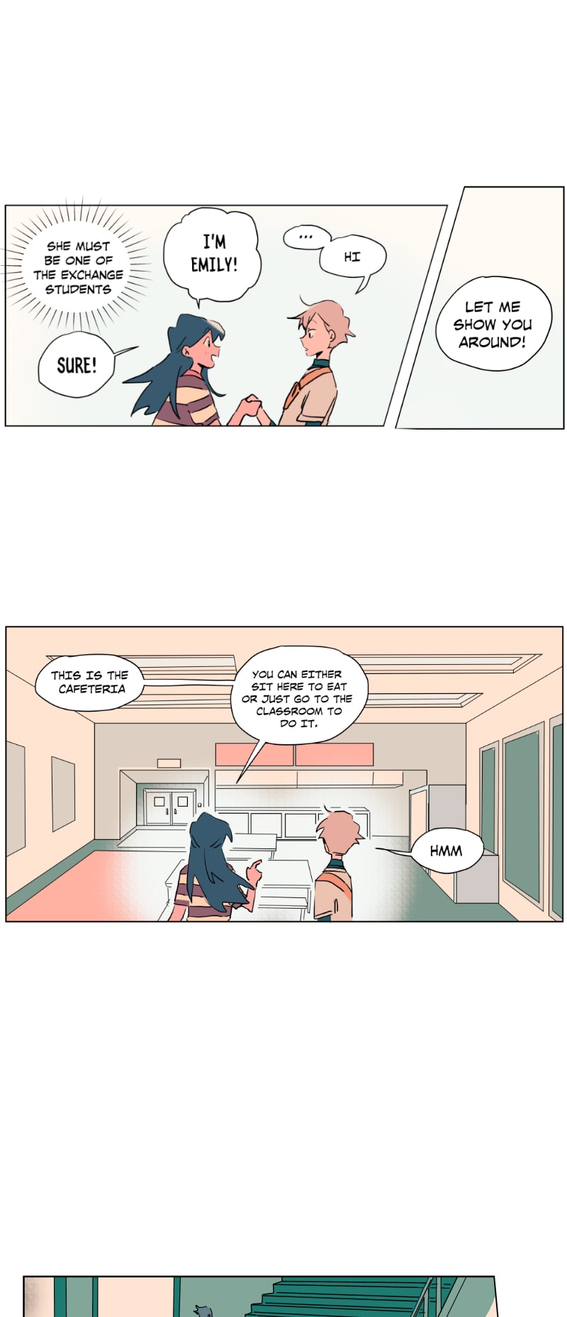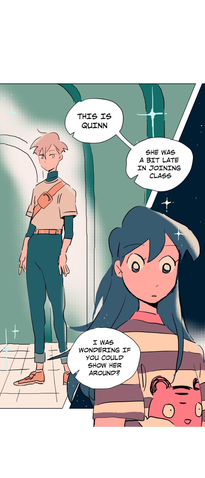 I really like this schedule and length of these episodes currently! Rather than long or short episodes, I really love when something substantial happens each update (something spurring a reaction from the characters or the readers) - previously Emily was caught up to speed abt her present situation (and so have we as readers) and there was a new student; here Emily shows Quinn around the school and surprise! Quinn is also from the branch (I rlly loved the shift from untalkative person to assertive person!)