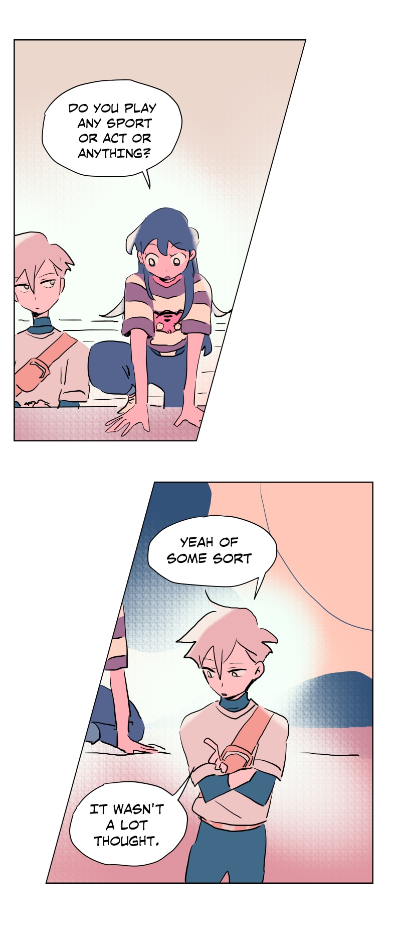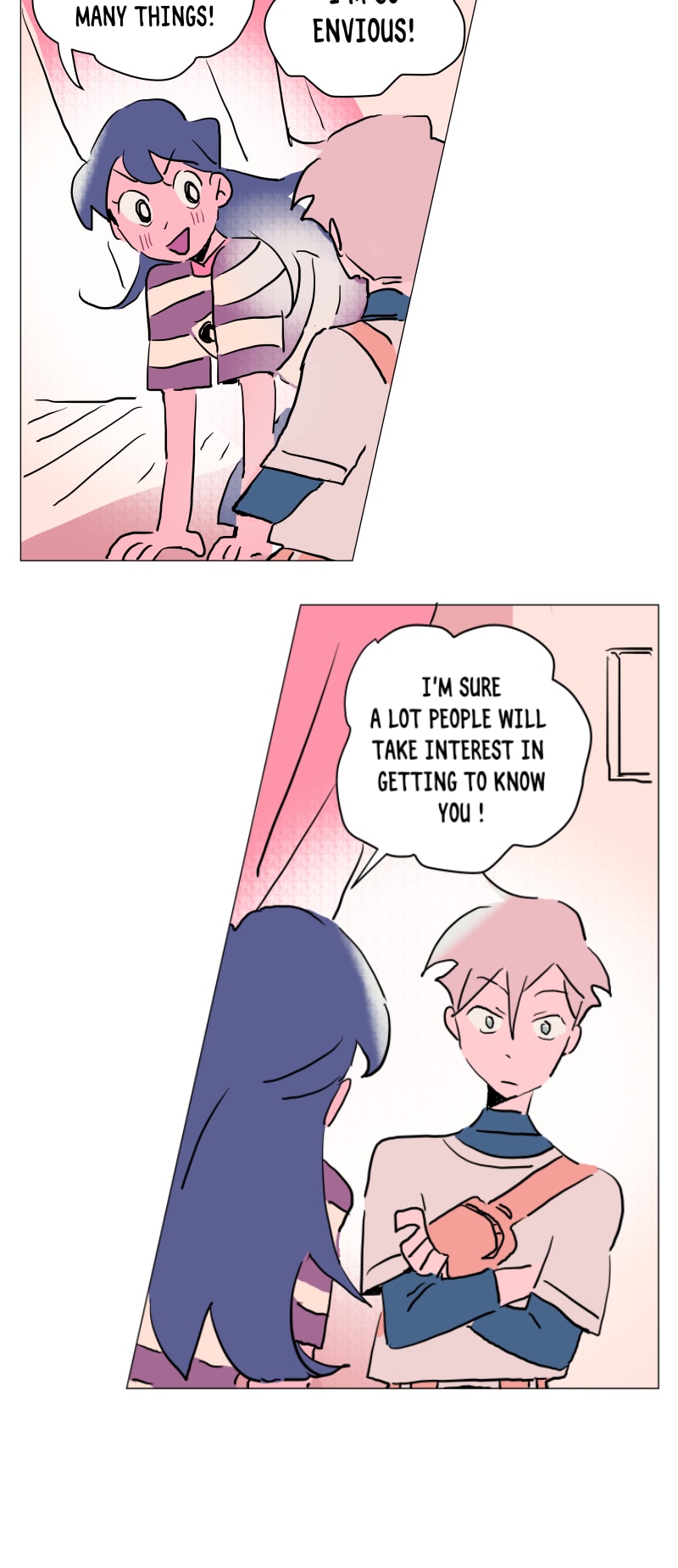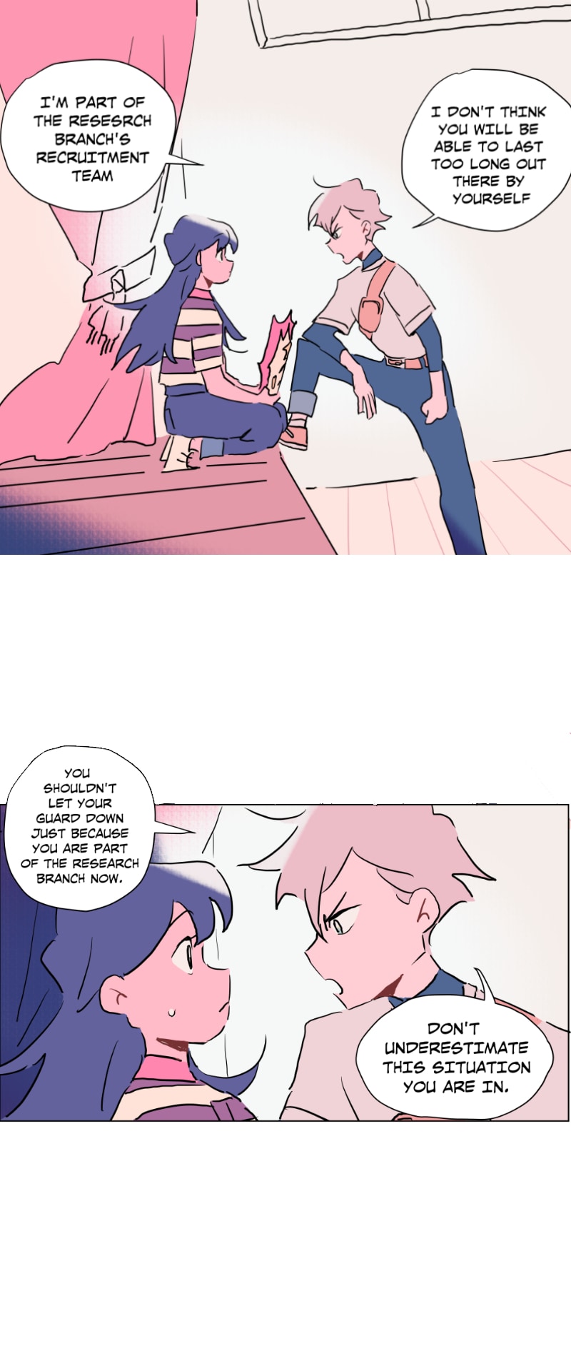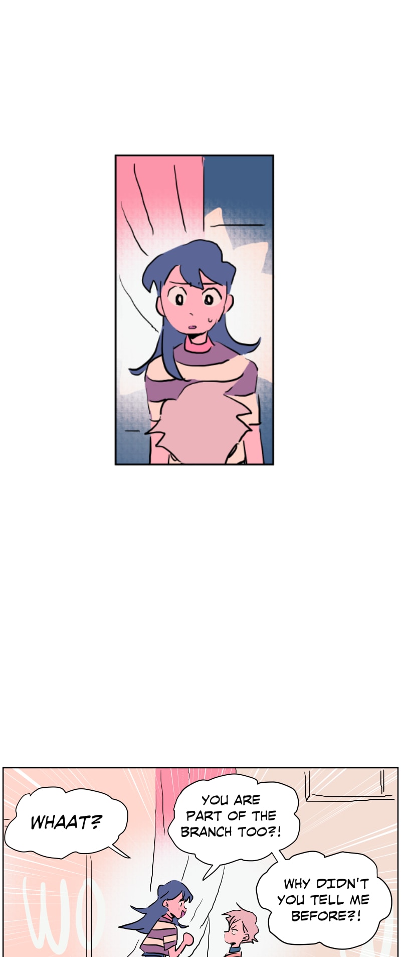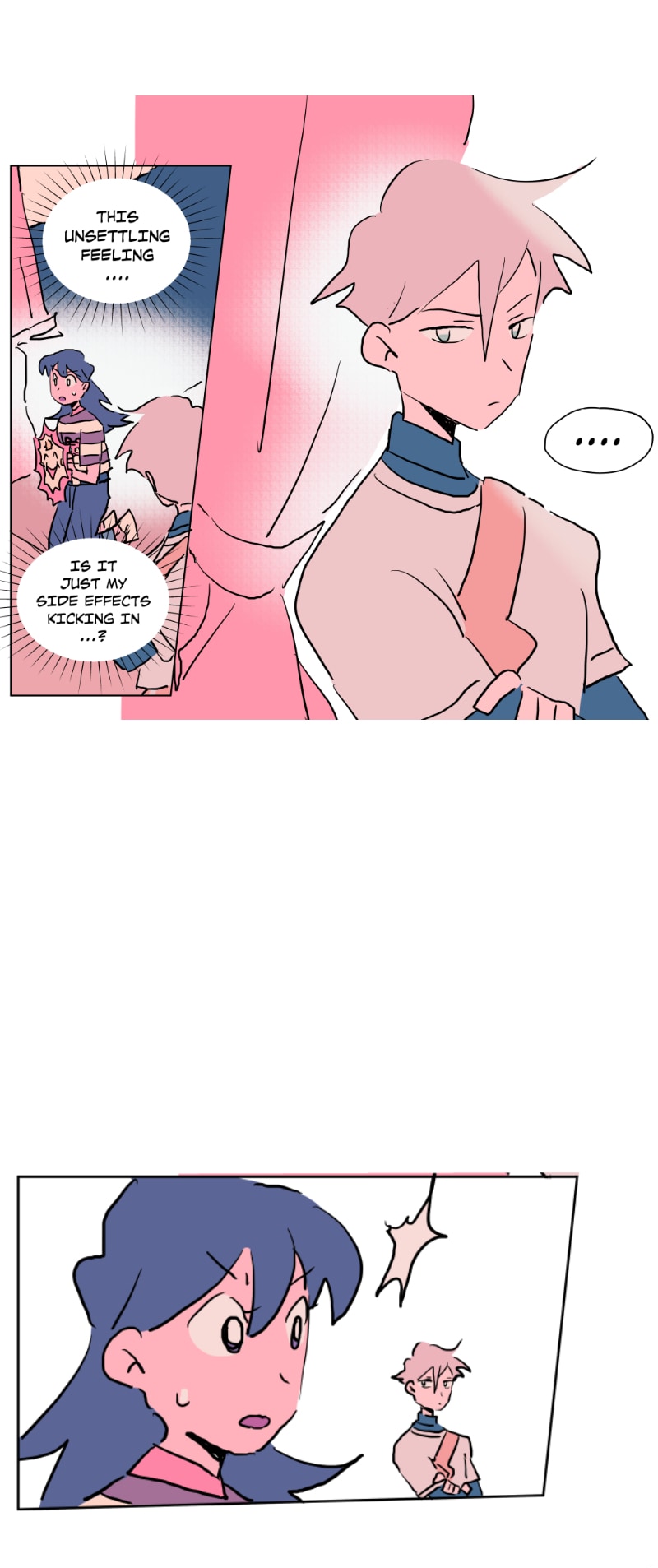 I really like this schedule and length of these episodes currently! Rather than long or short episodes, I really love when something substantial happens each update (something spurring a reaction from the characters or the readers) - previously Emily was caught up to speed abt her present situation (and so have we as readers) and there was a new student; here Emily shows Quinn around the school and surprise! Quinn is also from the branch (I rlly loved the shift from untalkative person to assertive person!)