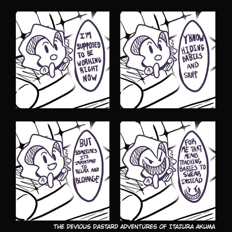 "The Devious Dastard Adventures Of Itazura Akuma And His Trusty Side-Kick Hellbender" is a comedy focused web comic series based off of the characters Itazura Akuma and Hellbender from Fate's Wish. The series will follow the mischievous demon Itazura and Hellbender in their many escapades, as well as many short comedy comics of their everyday lives.