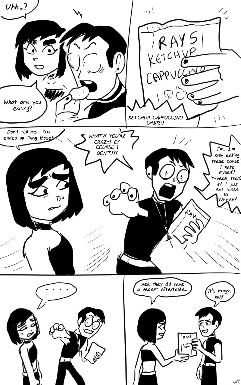 Maybe it is ketchup and cappuccino Inspired chips. Test Kitchen Chip Cook: (drinking cappuccino while staring at an Andy Warhol ketchup study) "I've an idea. A perfectly OK idea."