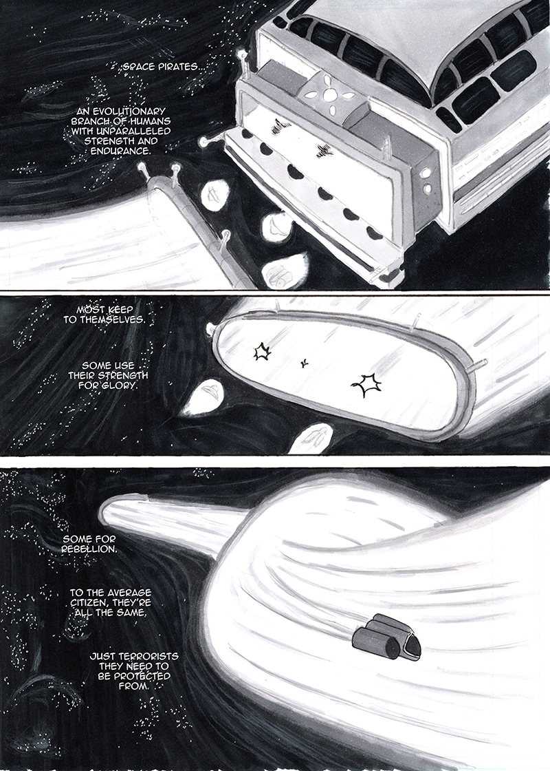 Space Pirate originally was an RPG Maker game I made waaay back in 2002. It was pretty awful, but the characters stuck with me all these years knowing I would use them again one day. In 2019, I started the manga as a means to improve as an artist. Before I knew it, I had over 200 pages. So, here's the ongoing result of that. Hope you enjoy the ride as much as I am!