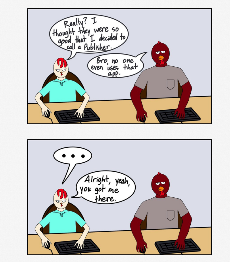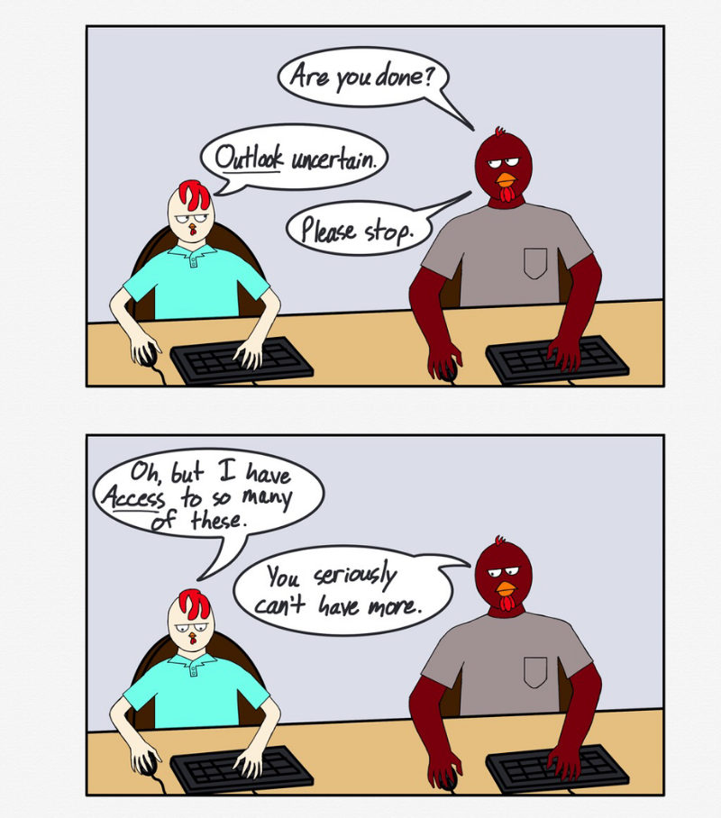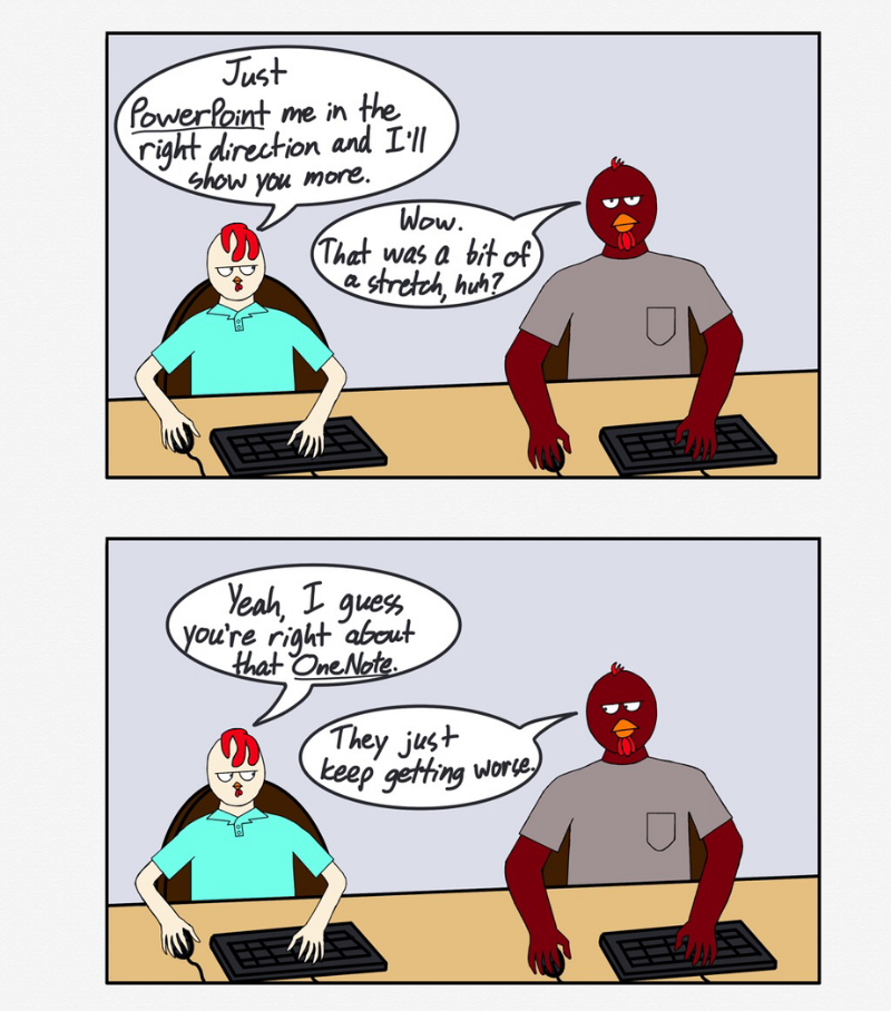 Chicken Business is a comic about the Rooster Brothers, JB and Big Red. Two brothers who work together in the IT department of one of the largest food suppliers in the nation. The comic follows JB and Big Red as they weave their way through the perils of IT work and the shenanigans that come with it.