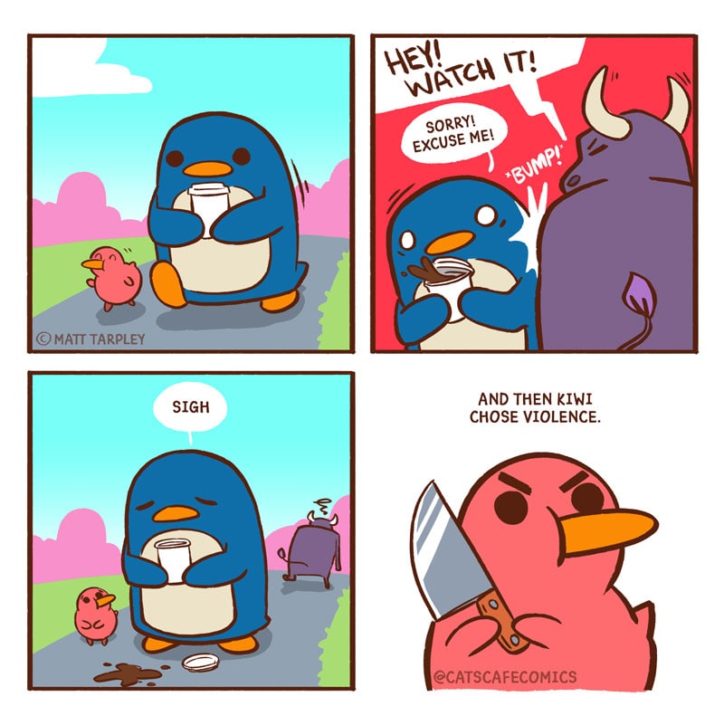 Kiwi: "kiwi" Bull: "oh no. Please don't! I'm sorry, Penguin!"
