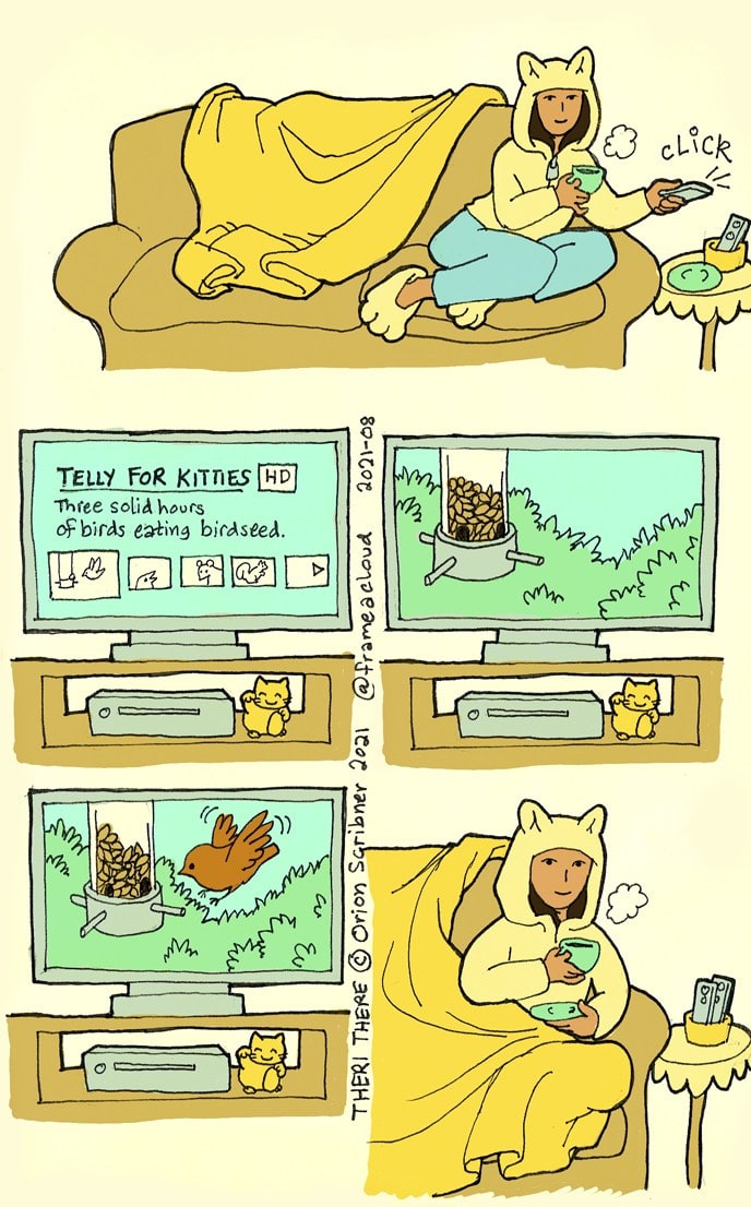 The TV screen shows a listing for a streaming program. It says, "Telly for Kitties HD. Three solid hours of birds eating birdseed."