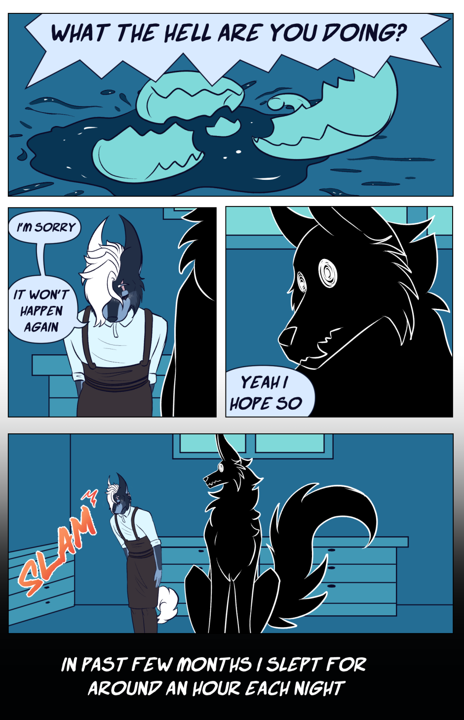 Slith a middle-aged barista, is being followed by a mysterious black dog with hollow eyes. By the time the creature is grown up Slith develops severe insomnia. Luckily, he found a solution for this dreadful ailment.