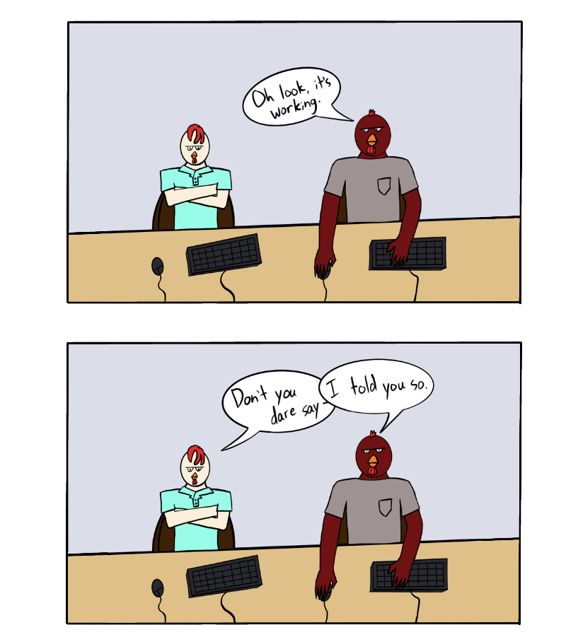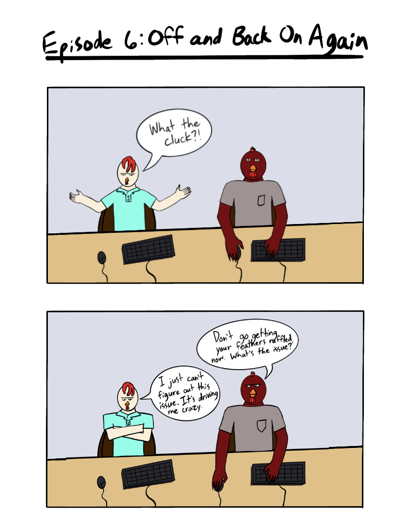 Chicken Business is a comic about the Rooster Brothers, JB and Big Red. Two brothers who work together in the IT department of one of the largest food suppliers in the nation. The comic follows JB and Big Red as they weave their way through the perils of IT work and the shenanigans that come with it.