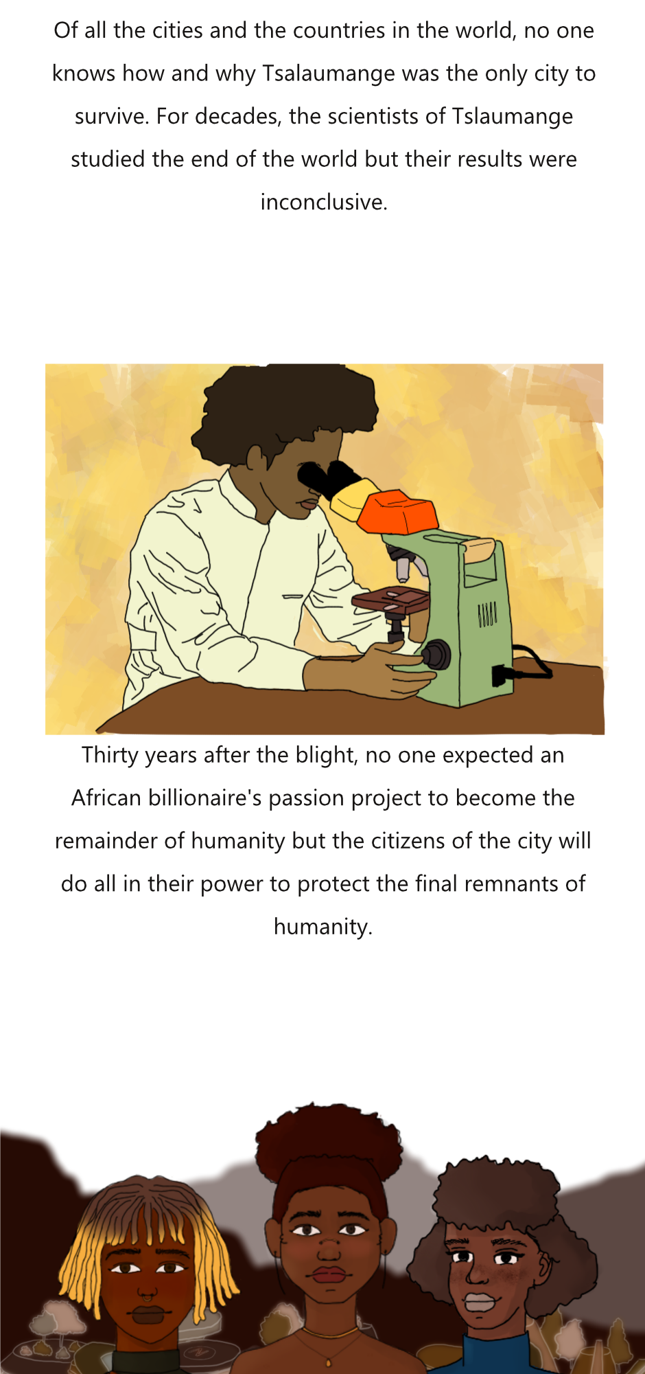 Over 50 years after the apocalypse, three separate women, Lipalesa, Nia and Safari, interact with a mysterious force within the city that is aiming to take down the city.