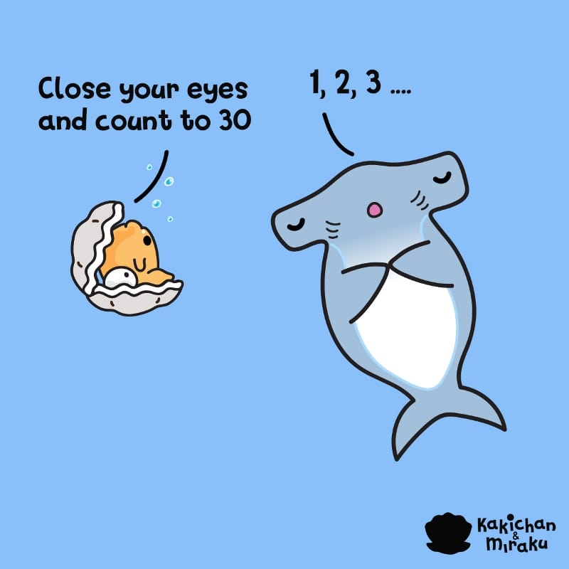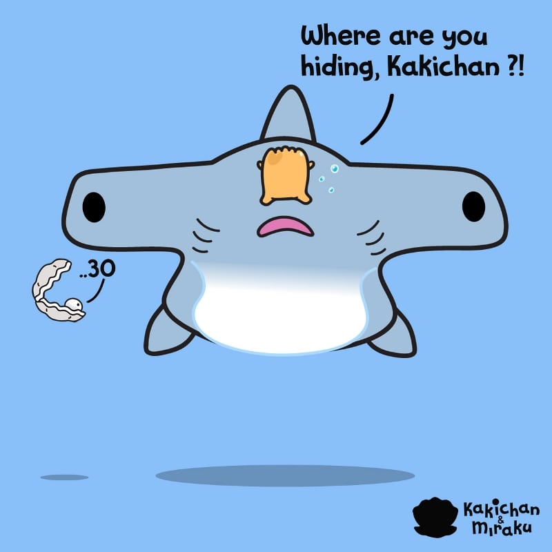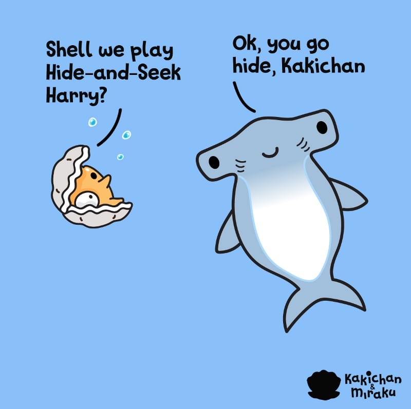 Kakichan the boy oyster plays 'Hide-and-Seek' with Harry the Hammerhead. Harry lets Kakichan hide first but Kakichan has ideas of its own. He sneaks right in the middle and under the nose of Harry. Harry the hammerhead shark has such a long head that he cannot see Kakichan at all.