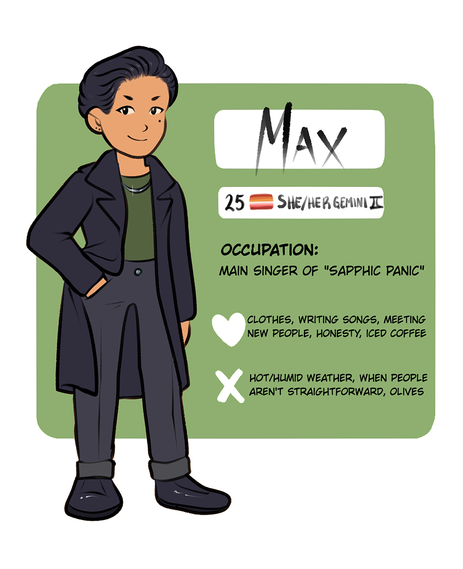 At last, another character sheet ! Once the main cast have all been introduced, I'll do an update with all of them. I've had that one ready for a while - we've seen Max a few times already but I was waiting for her to be properly introduced in the comic
