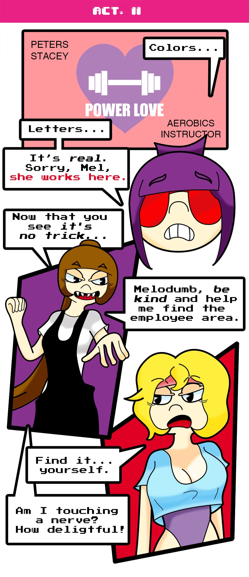 Powerlove is a small gym close to the arcades. She won't admit it, but Melody loves to casually go there after her work. Everyday.