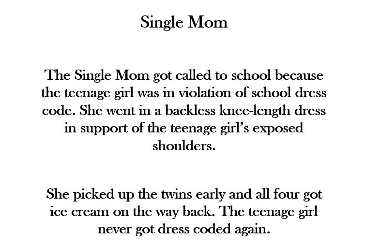 Teenage girl get dress coded for showing shoulders? Single Mom shows up in school in a backless dress to discuss the issue. They get ice cream on the way back.