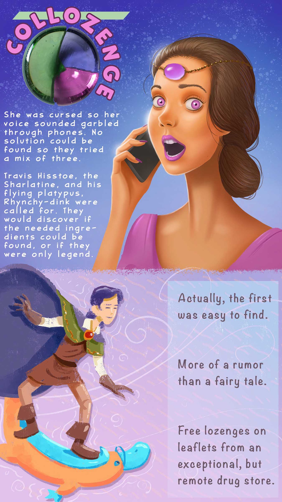 The Sharlatine and his flying platypus pal, Rhynchy-dink help a cursed princess. They seek ingredients to form a magic medicine.