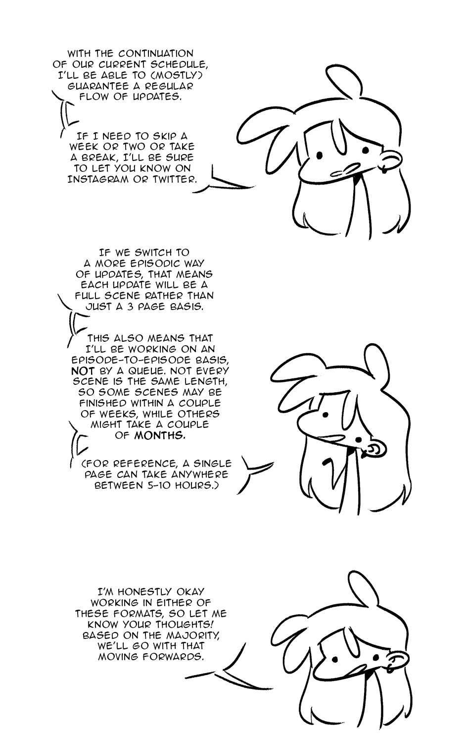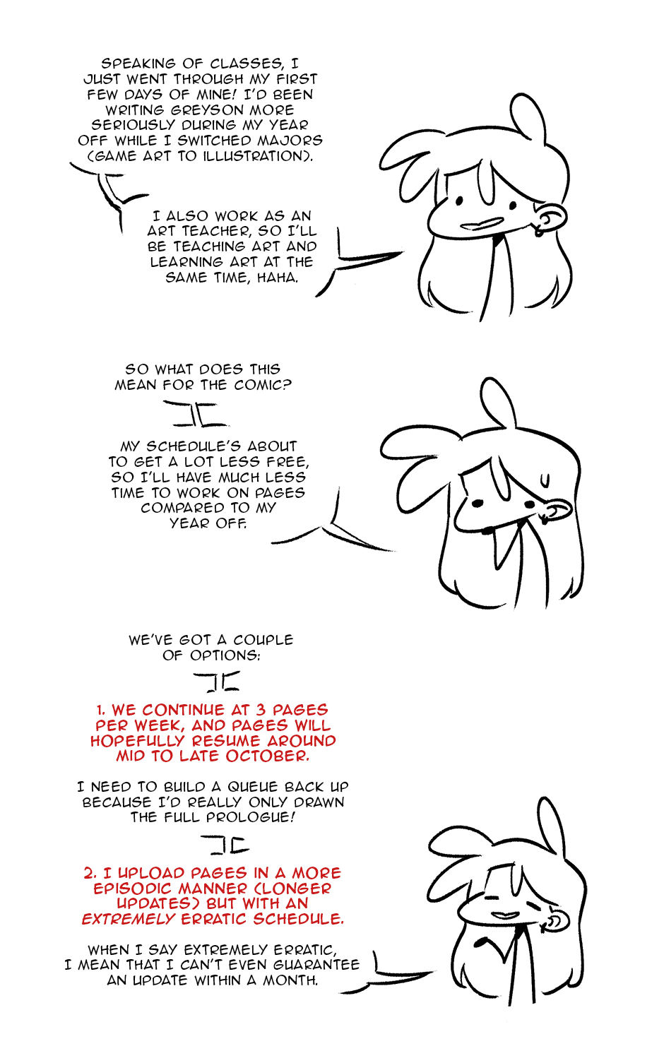 But the way I see it, fans and subscribed readers (like me) will be grateful for any updates that suit the lifestyle of the creator more than any particular set timetable! So I think you should go with what is the most stable for your workflow :D