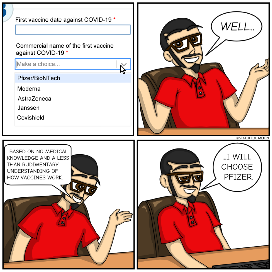 While this was a little late in the making (by now I've been vaccinated twice), I still find it funny how we were given the illusion of choice on this matter. Next week will be a comic on actually getting the vaccine. Stay tuned for that!
