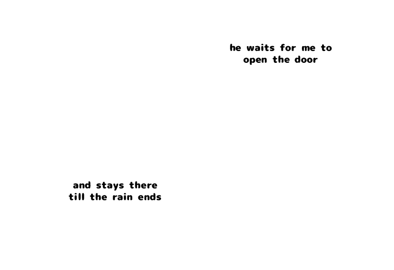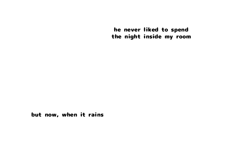 so now that's what happens every time that rains.. and I thought he was a tough cookie.. XD when he enters my room, he usually wakes me up to go out, but on rainy nights he stays till the morning.. [ PT-BR ] então é isso o que acontece toda vez que chove.. e eu achei que ele era durão.. XD quando ele entra no meu quarto, ele normalmente me acorda para poder sair, mas agora em noites chuvosas ele fica no quarto até de manhã..