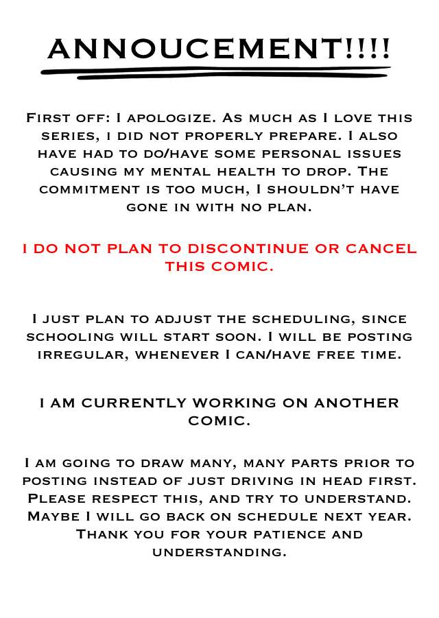 Sorry, but im under a lot of stress, I'm working on another comic but I'm just not setting a scheddule. Ive been meaning to post this for A WHILE. But never got arround to it, so I am sorry.