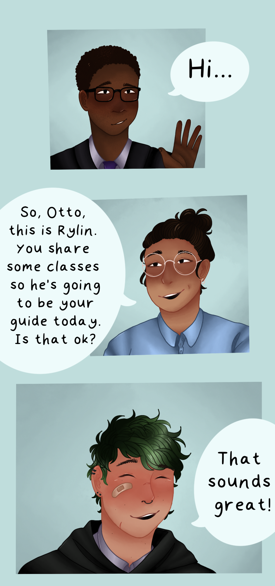Rylin is unsure of his opinions at the moment, and Otto is anxious, but outwardly cheerful as always! We'll lose the teachers and parents and get some interesting dialogue soon I promise. I can't wait to get them talking alone!