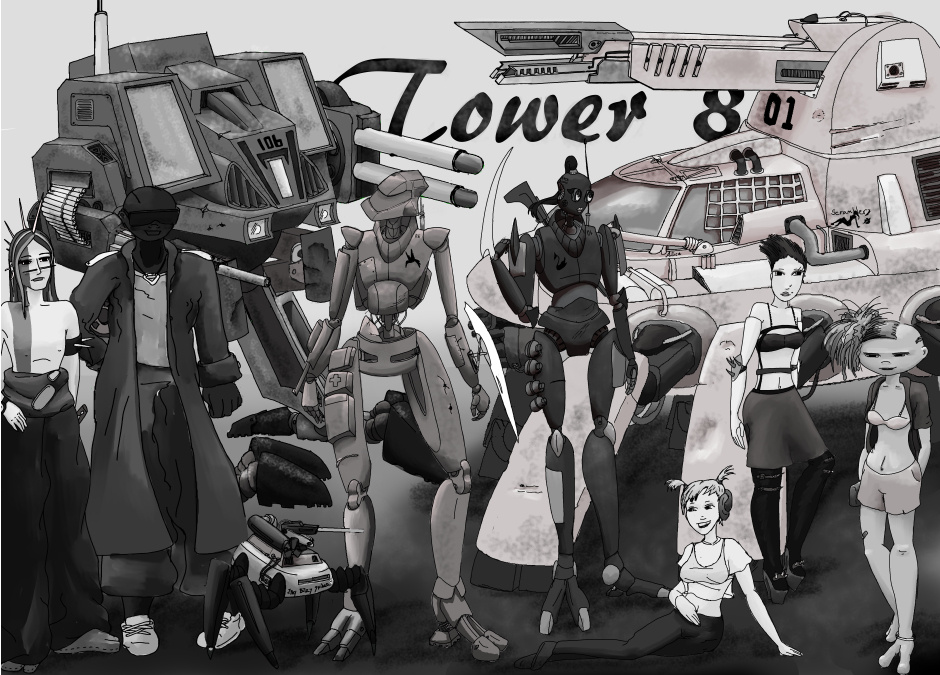 The mech pilots from tower 8 and their machines . From left to right Trent Evil pilot of the small roamer unit Itzy Bitzy. Houen James .pilot of 106 mobile artillery unit. Astrid Lang. Pilot of humming bird.the left hand humanoid bot Vanessa Evil .pilot of black swan .the dark humanoid bot . Alice Singer. Pilot of 01 mobile comand and comunications . All the mechs bar 01 are remotely operated using 01 as a relay point . The first chapter is coming soon .