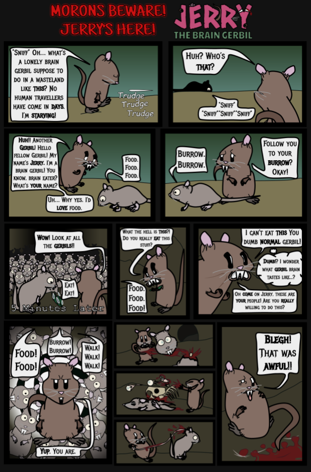 END STRIP: Immortal brain gerbil Jerry is an escaped lab experiment wandering the sands of the Sahara desert; looking for the brains of idiots to either feed on, or make smart again.