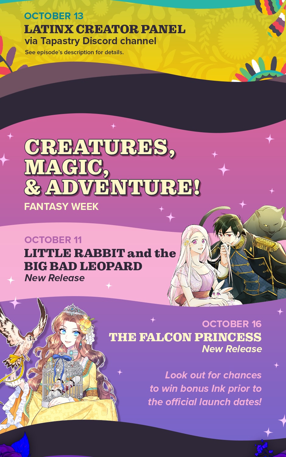 --- Latinx Creator Panel Event Info --- Join our Tapastry Discord channel to guest in our Latinx Creator Panel on Wednesday, 10/13 2:00-2:45PM PST! Discord channel: https://discord.gg/Tapastry Panelists: - Alex L. Curi (They/Them)| Series: Lacuna, IG: @alexlcuri - Audi (They/He)| Series: Lucid Memories, IG: @meganebii - Tami Babikian (She/Her) | Series: Jamie, TW: @TamiBabi_ - Amapora (She/Her) | Series: Comedown Machine & Lost and Found, TW: @amapora_writes