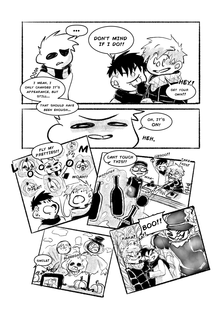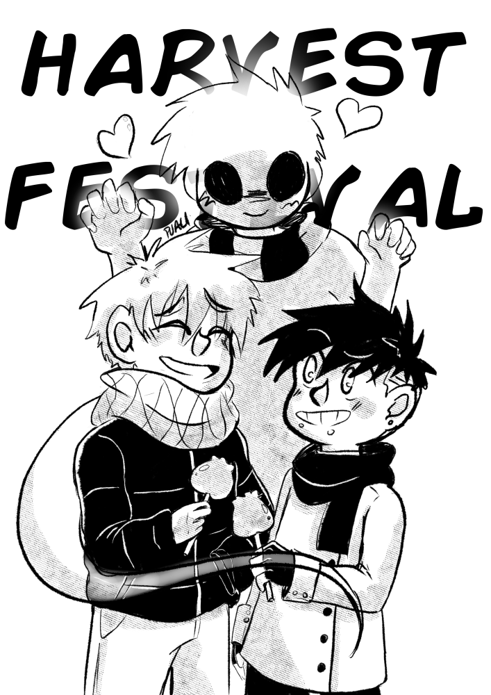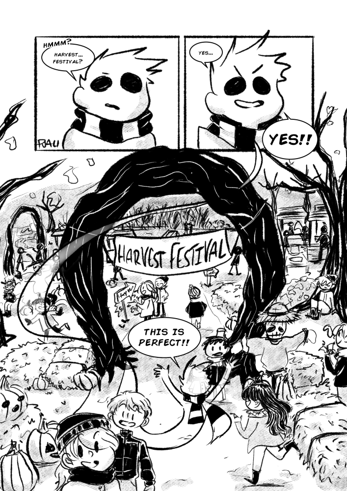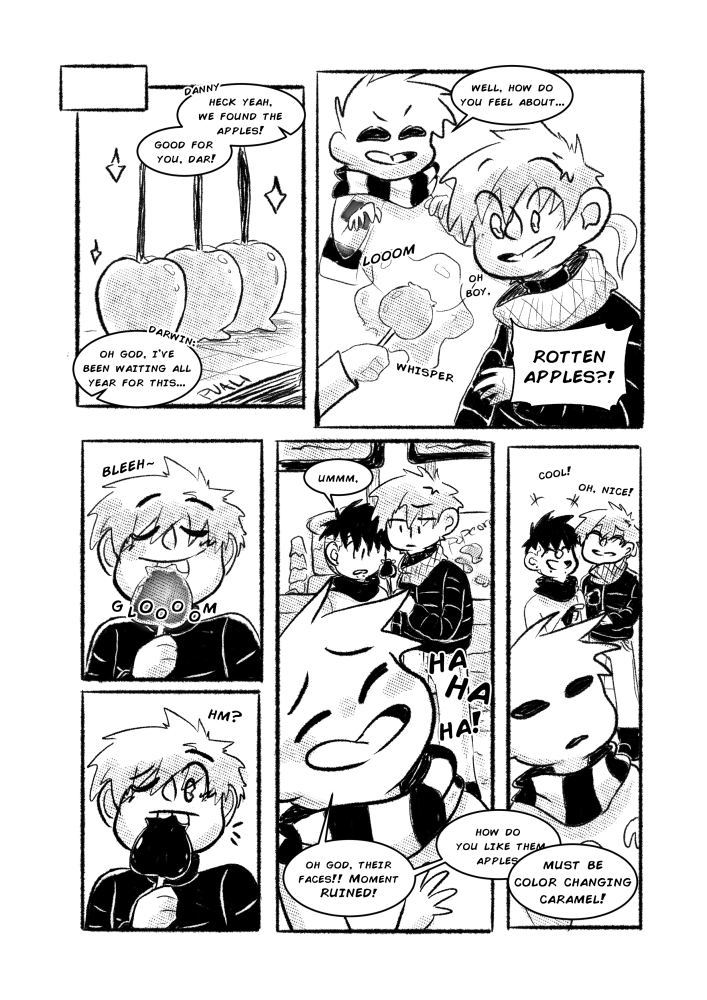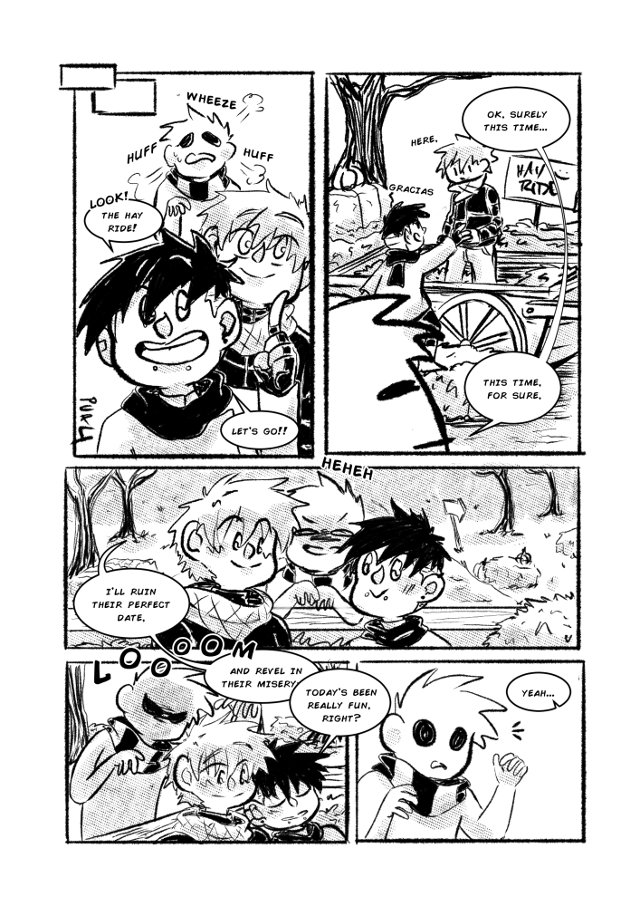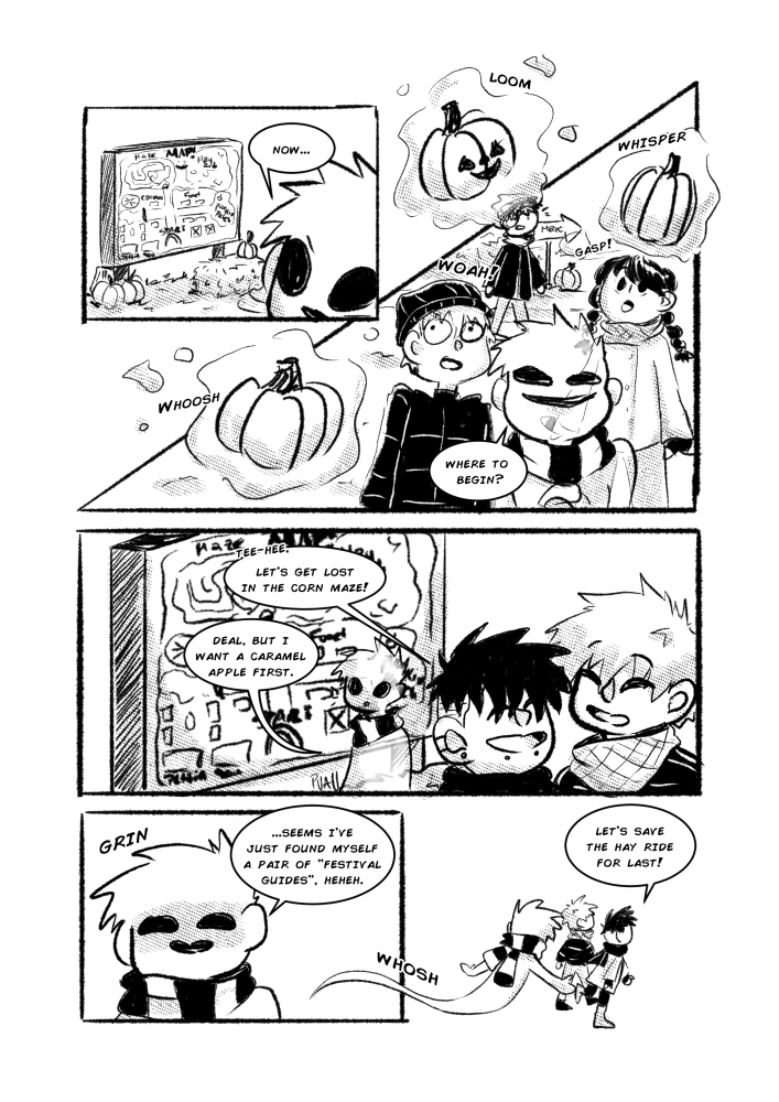 And of course, to wrap up last year's Drawtober, I decided to feature my boys from "Straight D's." <3 Danny and Darwin, and of course, one of my other favorite OCs, Tim! Tim's a mischievous little ghost boy that loves to cause mayhem. And that's exactly what he plans to do when he spots this lovey-dovey couple at his local harvest festival.
