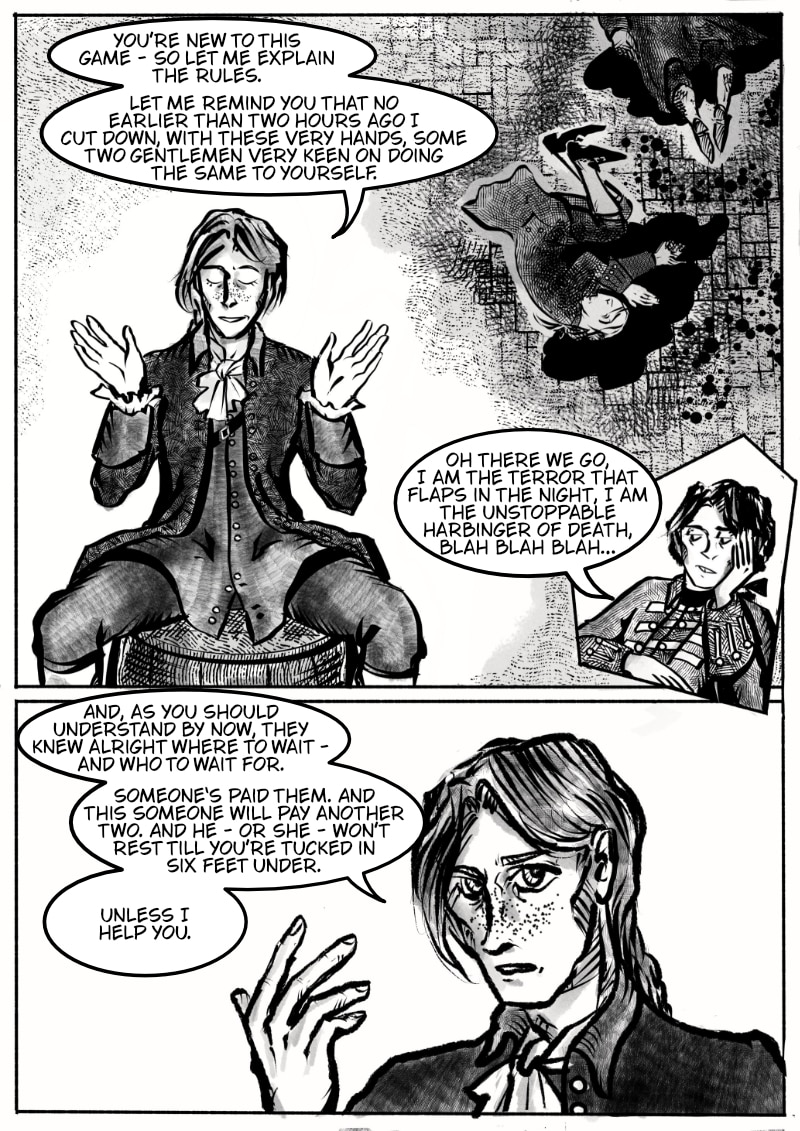Caution: potentially triggering topics are explored in the comic, including, but not limited to, PTSD, alcohol and substance abuse, sexism, homophobia, slavery, lots of murder and other things that the 1740s were unfortunately full of. This is a story about some formerly good people in an extremely lousy world. But hey, ruffles, swords and swashbuckling, right?