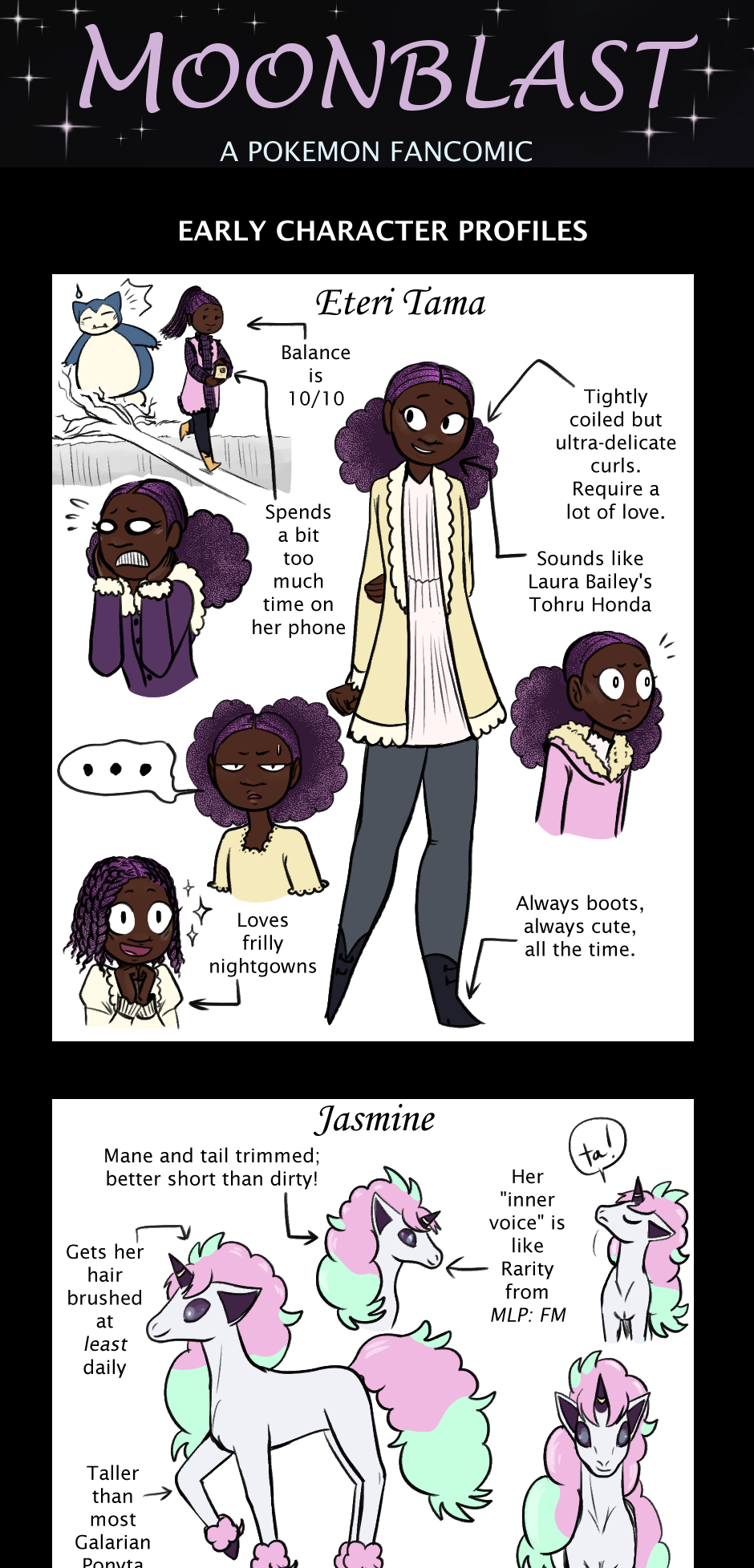 Moonblast is a fancomic written and drawn by Mahira (aka M.C. Aquila), full of sweet Pokemon adventure, mystery, wonderfully wicked female villains, and Halloweeny & autumn vibes, taking place in Kalos and Galar.