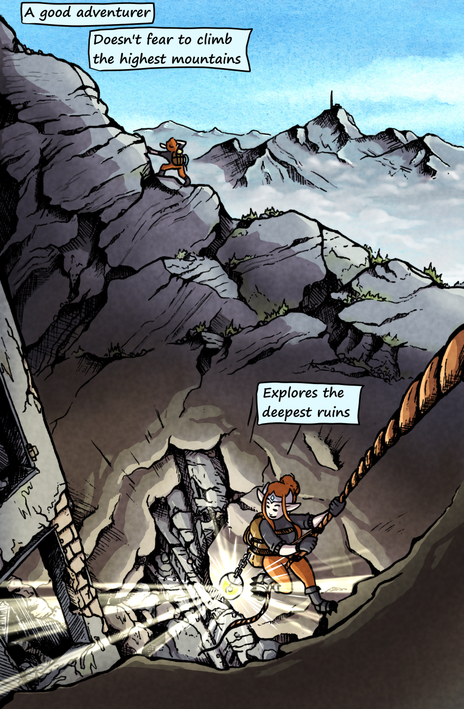 17. August 23 Update of page 1. I did some sketches and I loved how they turned out. So this is the finished new first page. Lines are made traditionally, colors digitally with some watercolor backgrounds.