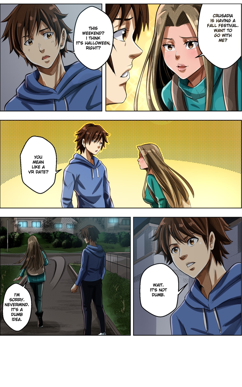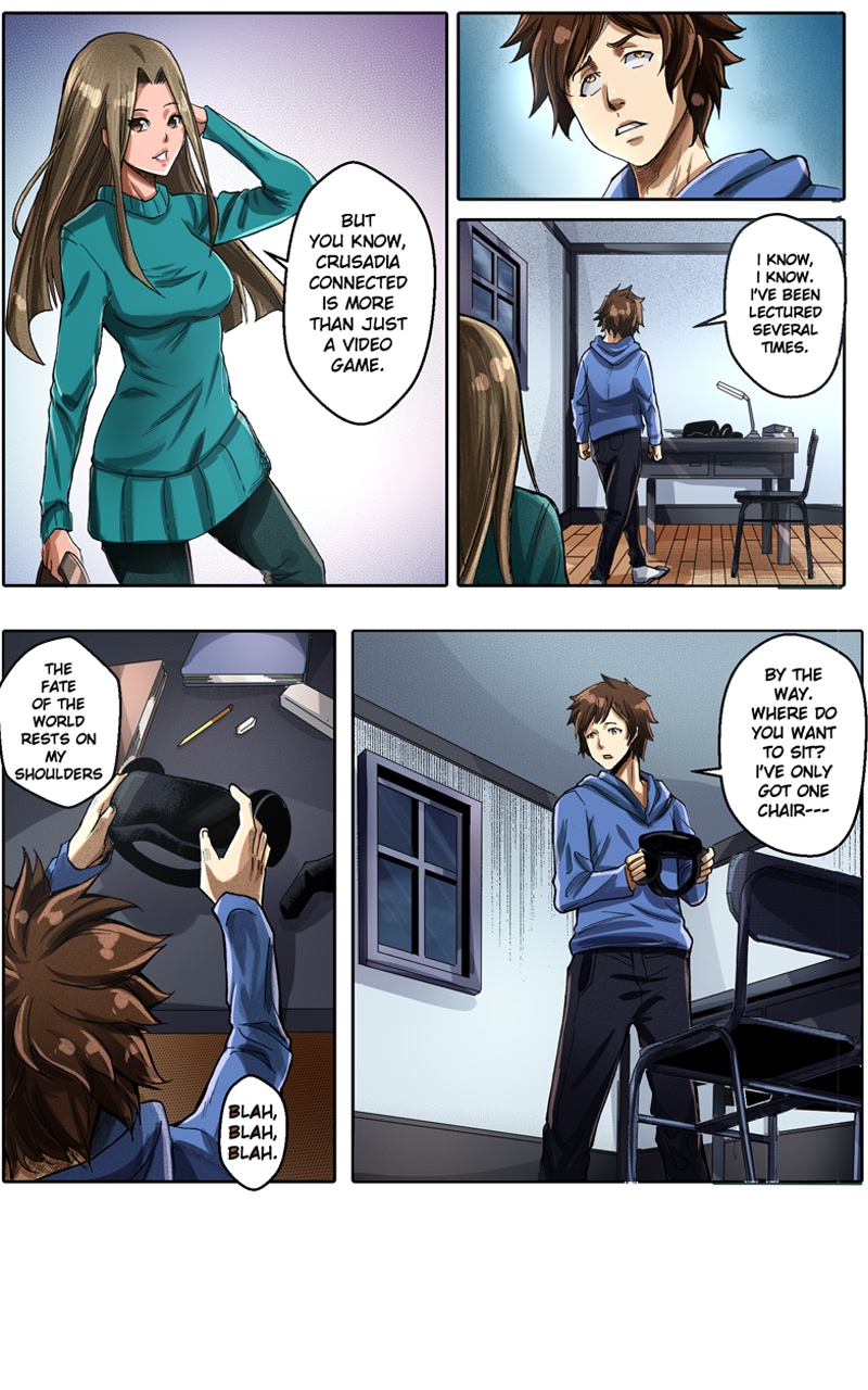 In the near future, Crusadia Connected is an extremely popular online, virtual reality game. It is so popular that almost everyone on earth has an account. Players are encouraged to play however they want: go on quests, shop, date, join a guild, and most importantly connect with others. Crusadia Connected is celebrating its seventh year and soon there will be a major announcement that will change everything...