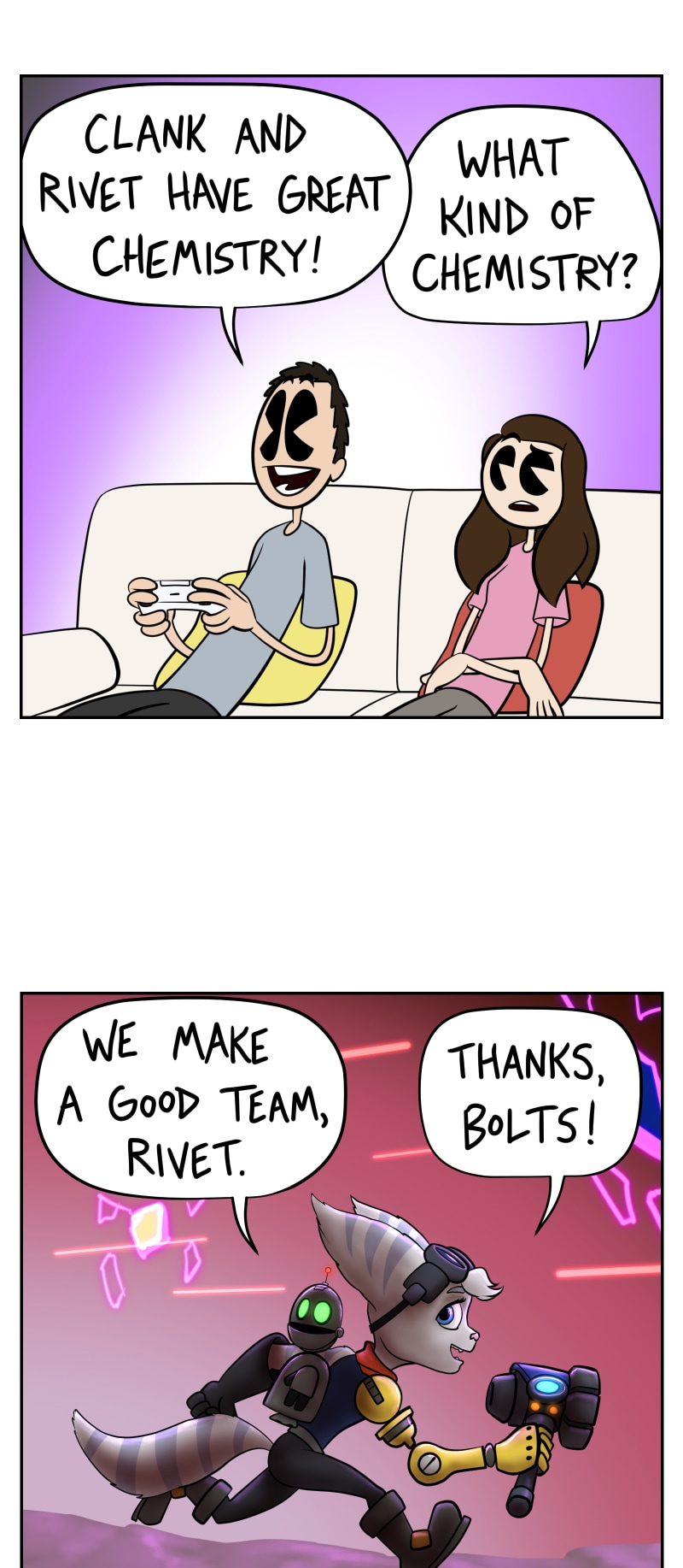 Ruolin and I make a lot of jokes about the media we consume. I ship because it's funny to me. Also just really digging Rift Apart. Look at that ray tracing!