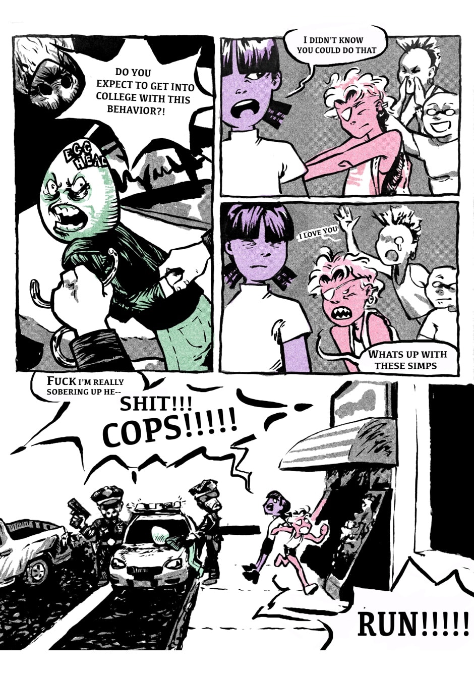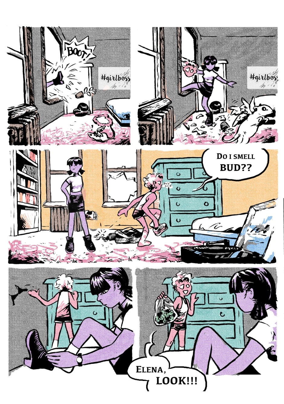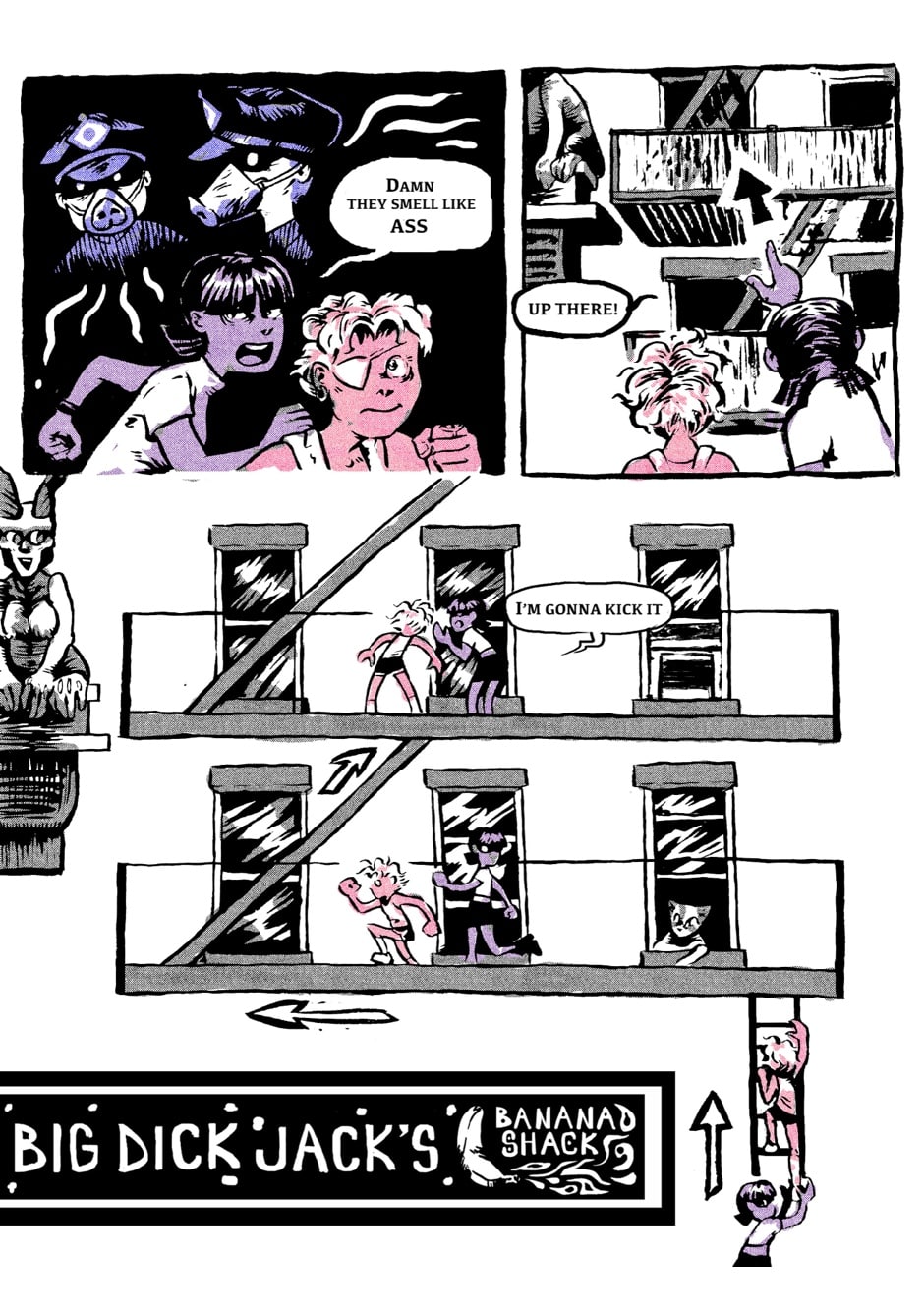 You ever been to Nightmare City?? Let Elena and Wilhelmina walk you through!!! We got undead cats in trash cans, a rabid fan of Ayn Rand, britpop bands in broken windows, Big Dick Jack’s Banana Shack, busy days for teen runaways, and a strange power in Mina’s gaze… say, why does Elena still wear turtlenecks in the summer???