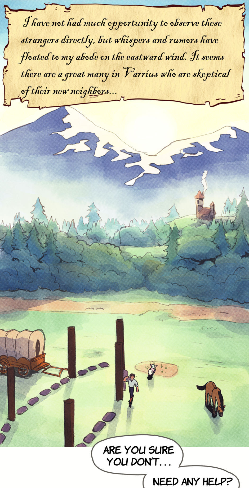 Deep within the Fyellkrid Mountains, tucked away in the peaceful Varrius Vale, there is a sleepy little village. The town, like the valley it rests in, is named Varrius, and it recently had some new arrivals. Orris and Mintha are experienced adventurers who have chosen to settle down in the calmest place they could find. They'll soon find out that, just because there aren't any demons or dragons around, it doesn't mean life in Varrius Vale isn't full of adventure!
