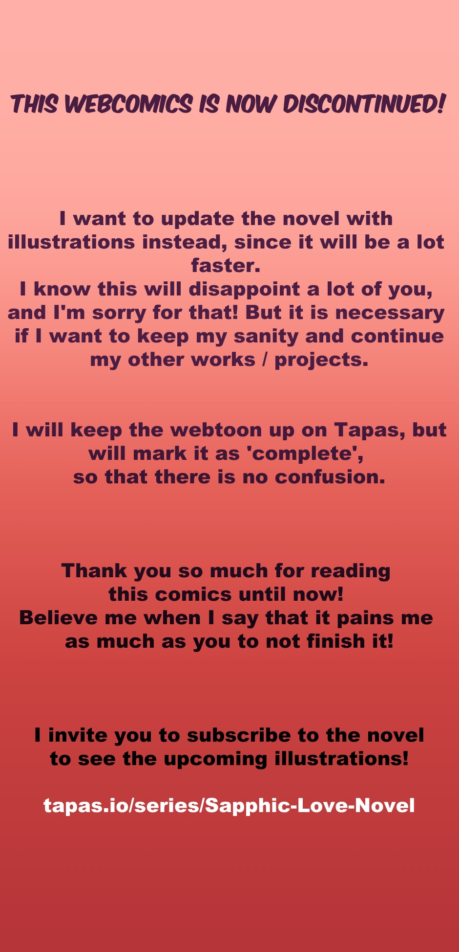 I will leave it up here on Tapas for the people who want to read, or re-read the available chapters. But the action will now happen on the novel's page, where I will update the chapters with new illustrations!