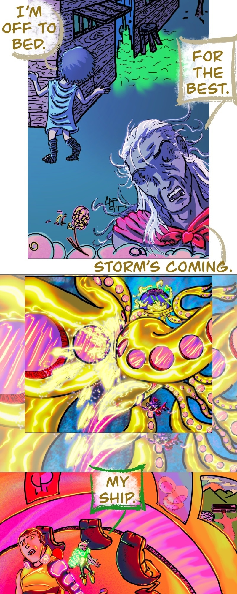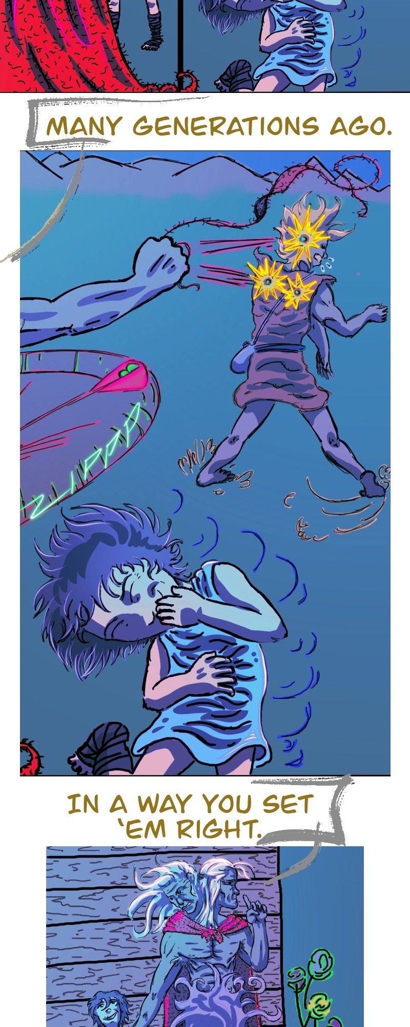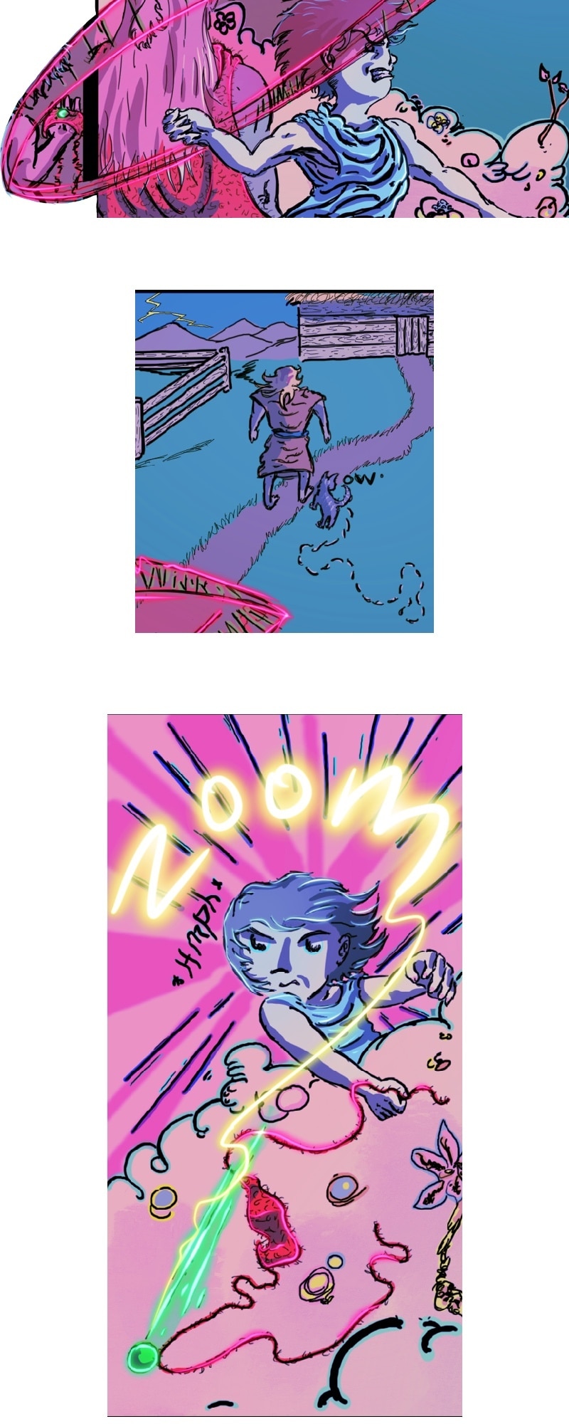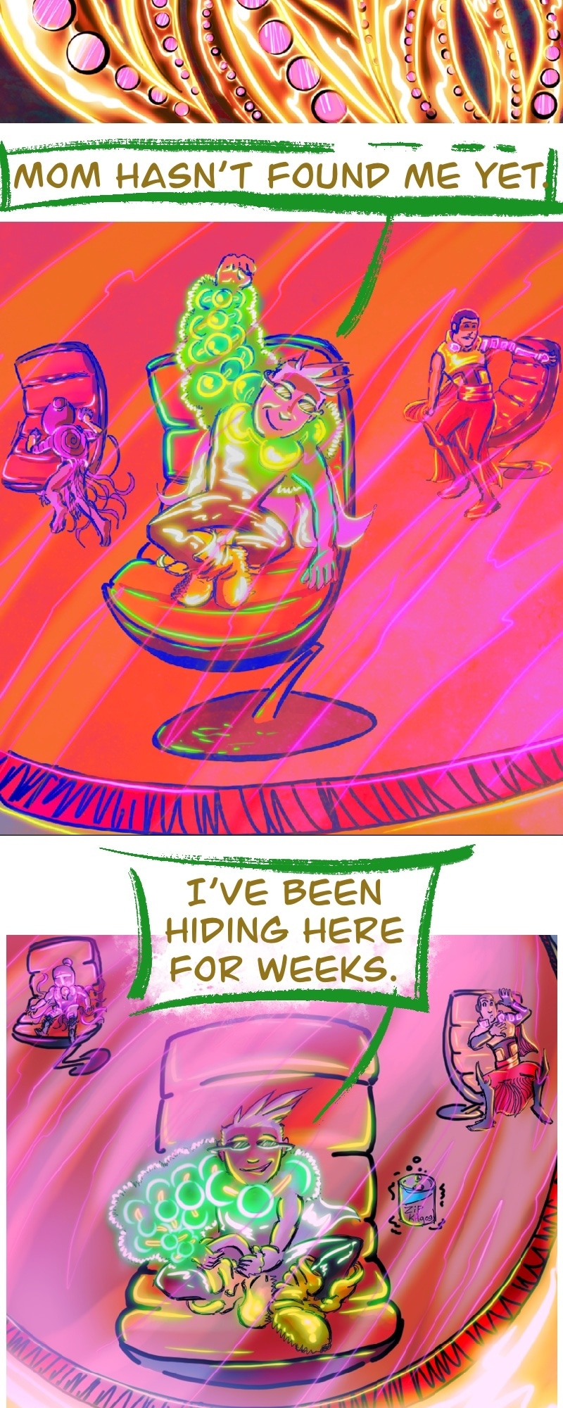 CHILL. Life’s short. Make yourself happy. This comic in this format is more about a chill scrolling vibe and less story driven. It does have a complex story in the background.