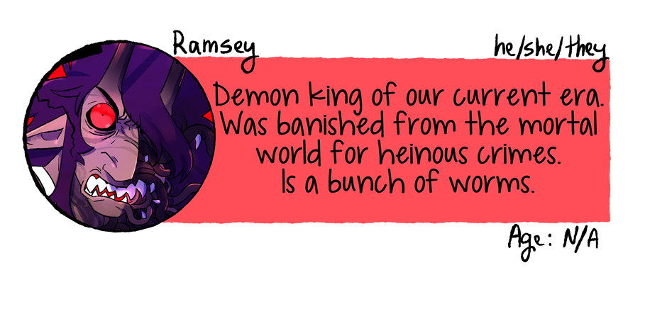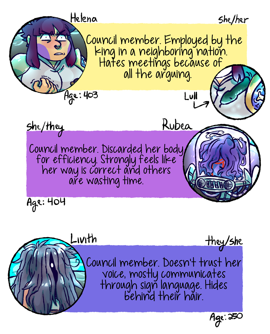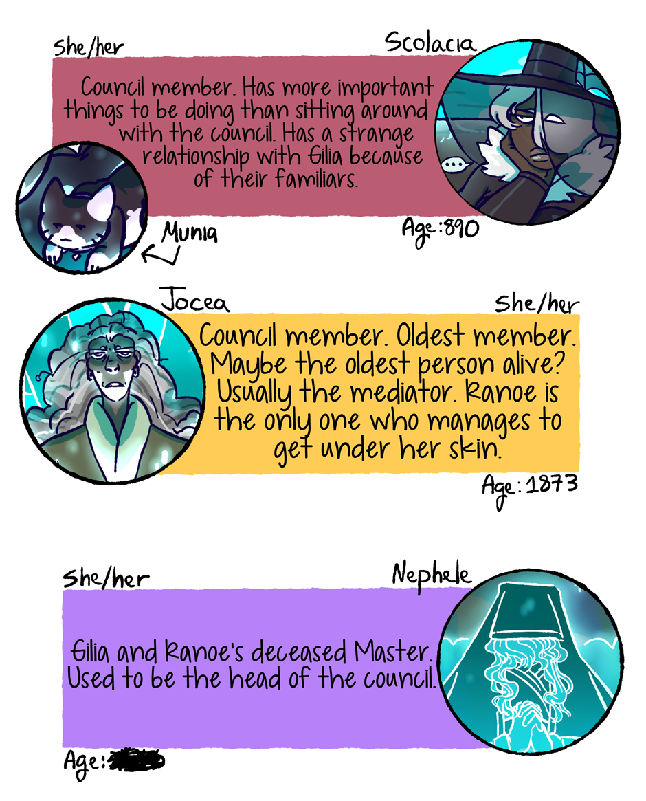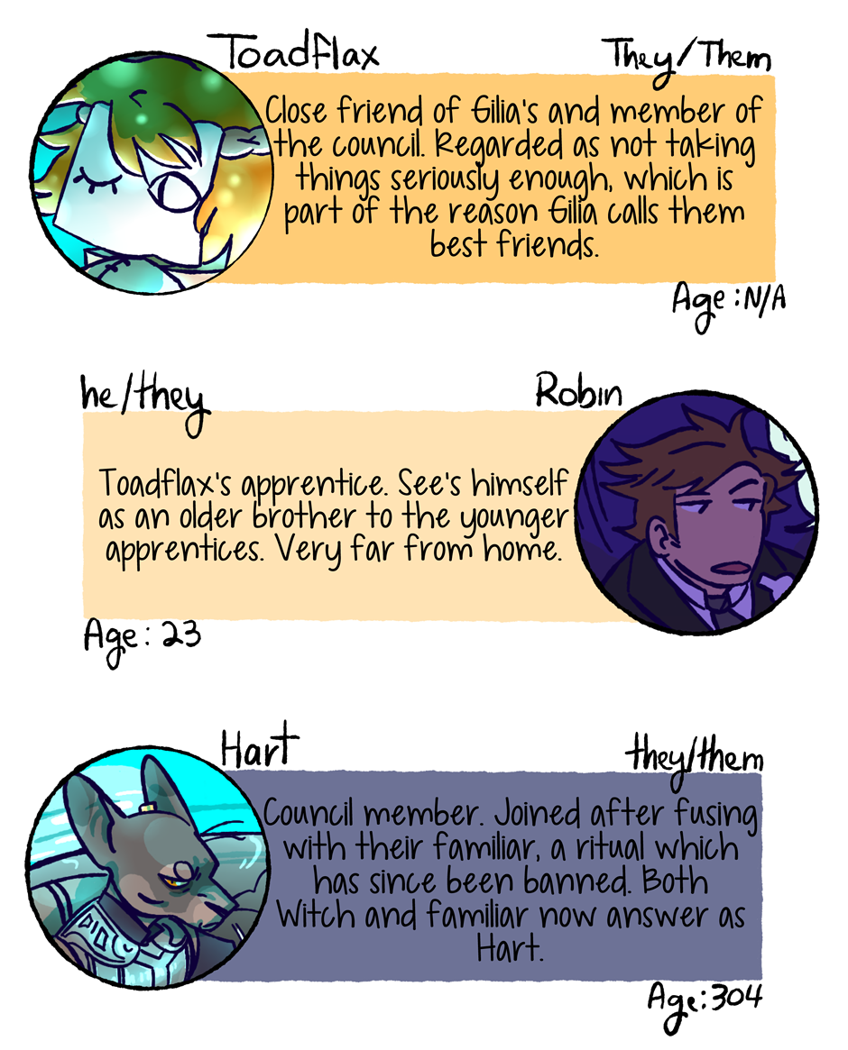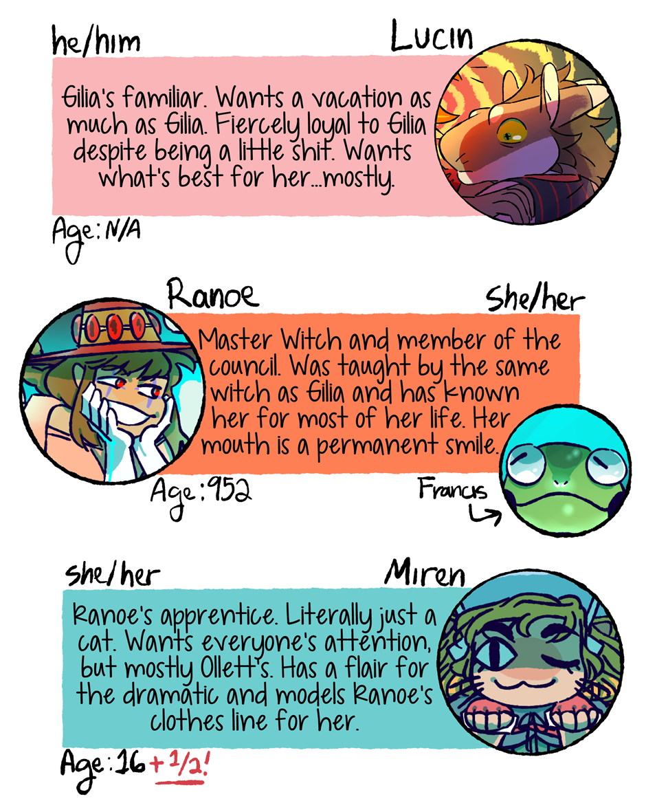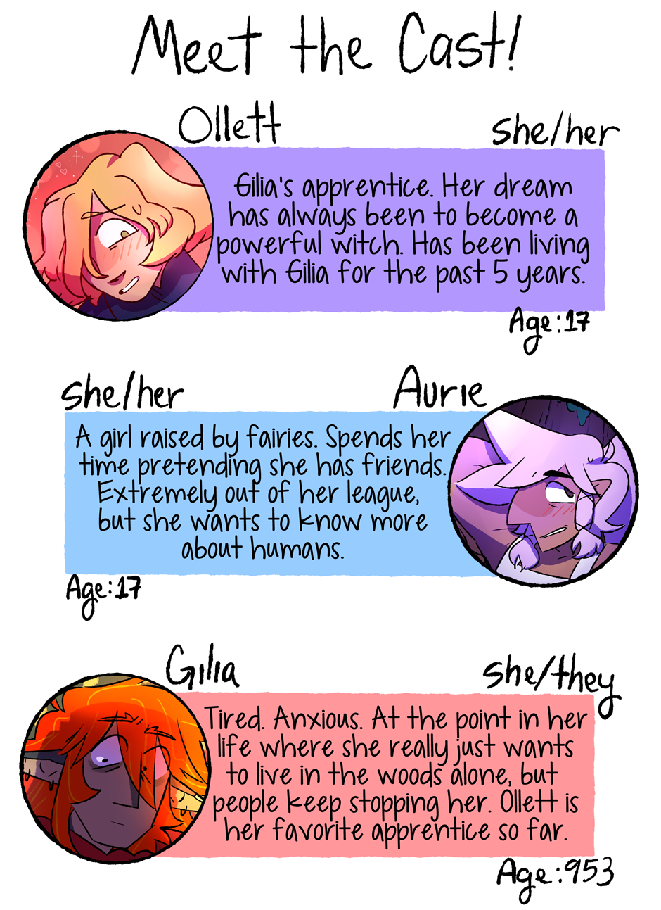 In the mean time enjoy this cast page update! I've wanted to say everyone's pronouns for a while, and I had a question about ages on my tumblr that I wanted to clear up as well. When new characters are introduced, or new information becomes more pertinent, I think I'll post mini cast updates in between future chapters. Thanks for reading, see you again soon!